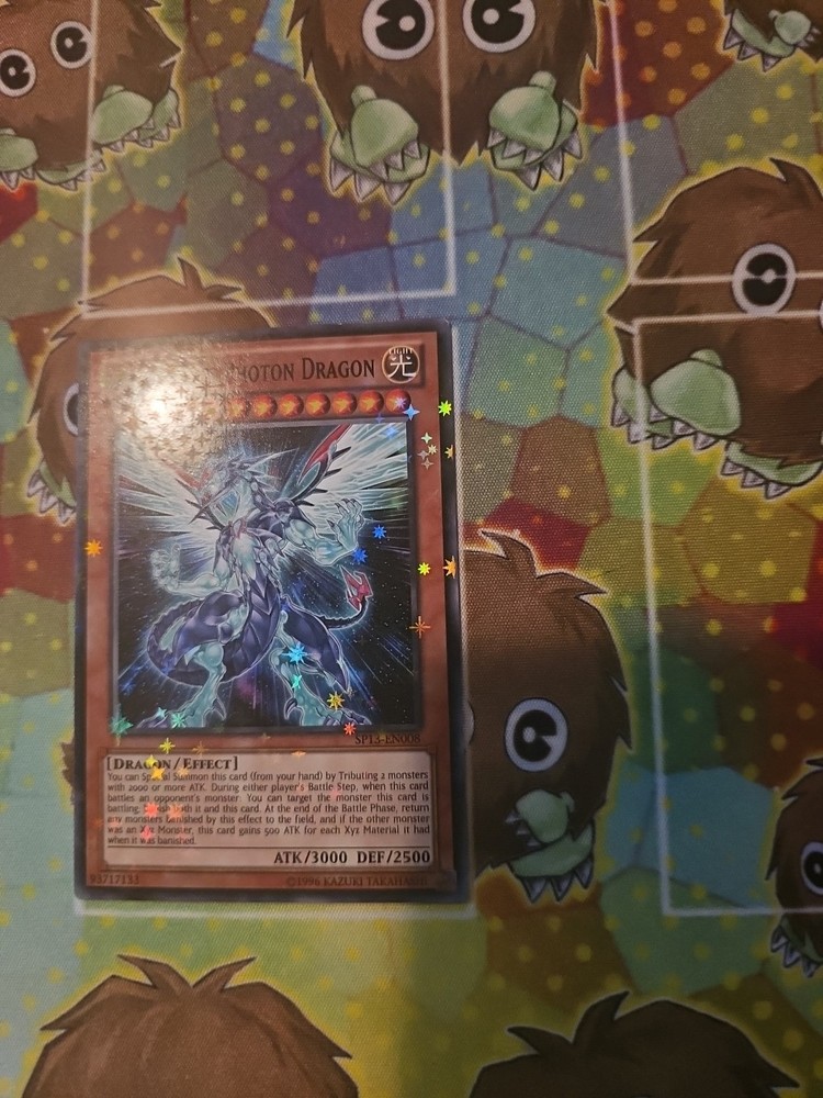 The "Galaxy-Eyes Photon Dragon" card is a powerful Level 8 Dragon-type monster from the Star Pack 2013 set in the Yu-Gi-Oh! TCG. It has an impressive 3000 ATK and 2500 DEF, making it a formidable creature on the field. Its special ability allows it to be Special Summoned by tributing 2 monsters with 2000 or more ATK and banish both itself and the opponent's monster it battles during the Battle Step. Additionally, if the opponent's monster was an Xyz Monster, this card gains 500 ATK for each Xyz Material it had when banished. The card is a Starfoil Rare, featuring a foil finish, and comes in English language.