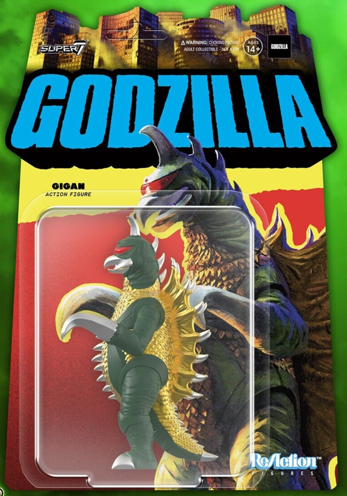 Gigan ReAction Figure With scythe-like hands, blades on its belly, giant dorsal wings, and a single visor-like eye, it’s no mystery that Gigan is the product of alien technology! This 3.75” scale Toho ReAction Figure of Gigan features detail inspired by its appearance in the 1972 film Godzilla vs Gigan with metallic gold and silver accents. Add this tiny titan of terror to yourToho ReAction Figure collection today!