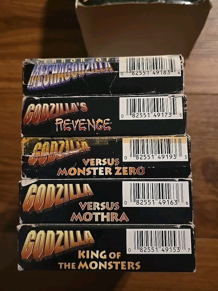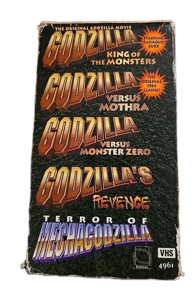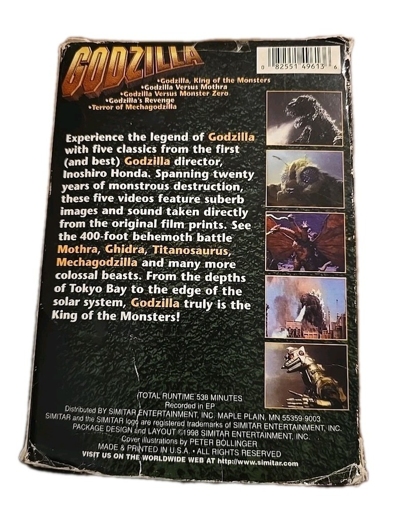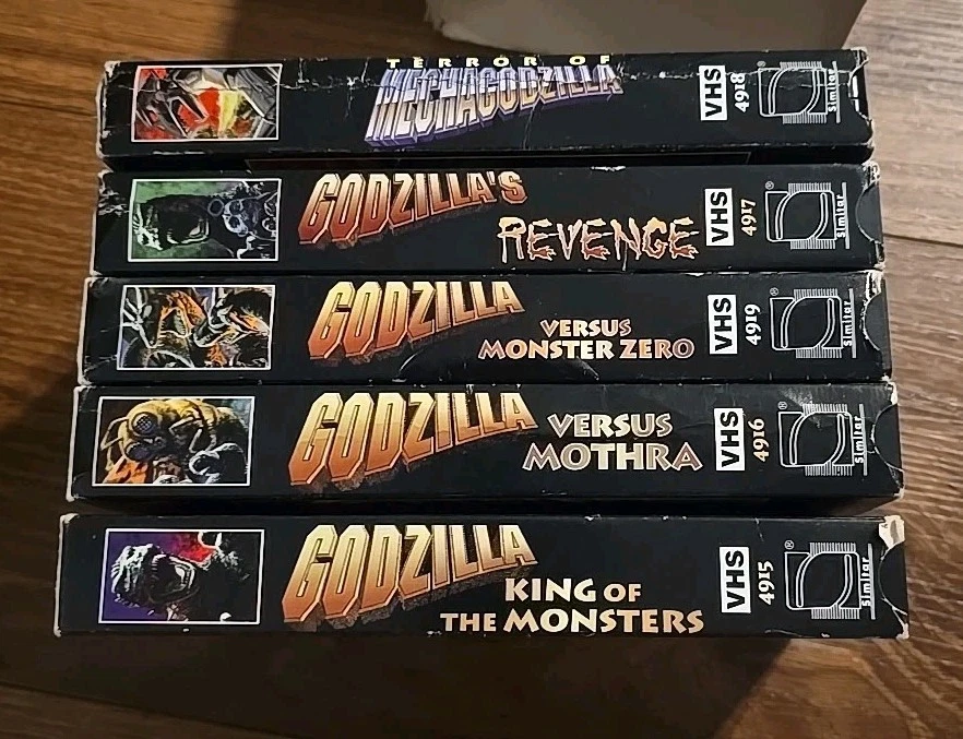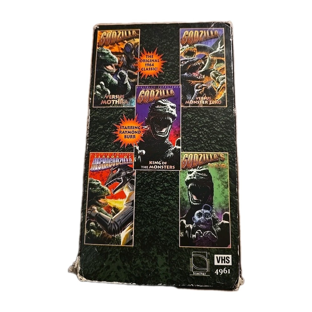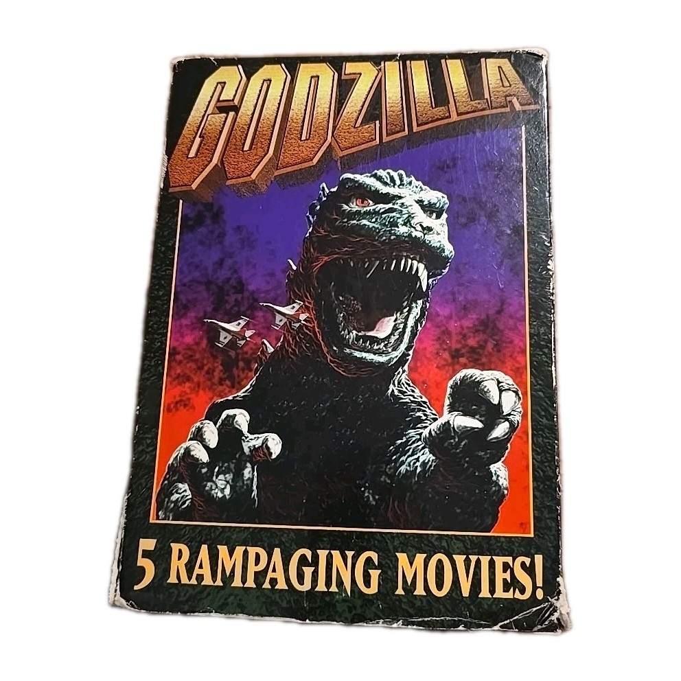 The box show some signs of wear, but it in good shape considering the age. The VHS slip covers have wear, some have tape on the top. VHS tapes are in excellent condition and playback without issue. Movies are: Godzilla king of the monsters 1956 Godzilla vs mothra 1964 Godzilla vs monster zero 1966 Godzillas revenge 1969 Godzilla vs Mechagodzilla 1978 The product is a box set of 5 VHS tapes titled "Godzilla 5 Rampaging Movies" released in 1998 by Simitar. The VHS tapes feature action and adventure films with a monster sub-genre, all in English language with NTSC signal standard. This collection offers viewers a thrilling experience of the iconic monster Godzilla in a rampageous adventure across multiple films.