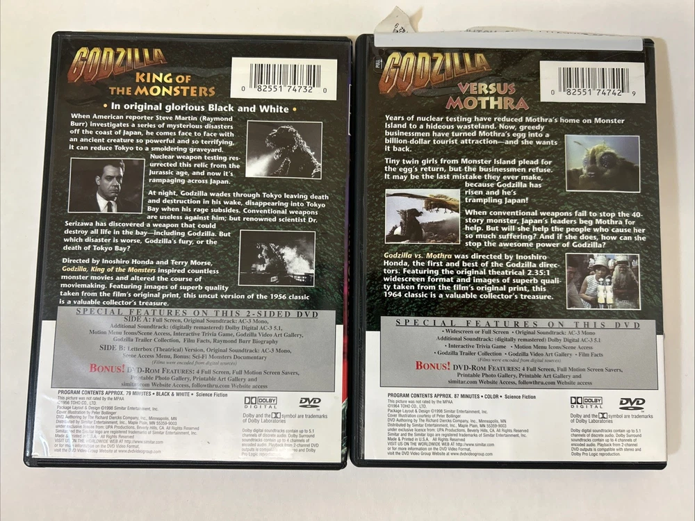 Two of the DVDs cases have been opened and the DVDs used. The remaining three are still sealed. Godzilla King of Monsters - used Godzilla versus Mothra - used Godzilla versus Monster Zero - New with shrink wrap Godzilla’s Revenge - New with shrink wrap Terror of Mechagodzilla - New with no shrink wrap Cases and labels are in great condition, no cuts or tears. Comes complete with inserts, which is in very good condition. Discs are in good condition with only minor scuffs, the two opened discs have both been tested and work great, the remaining three DVDs are new and still sealed. 5996