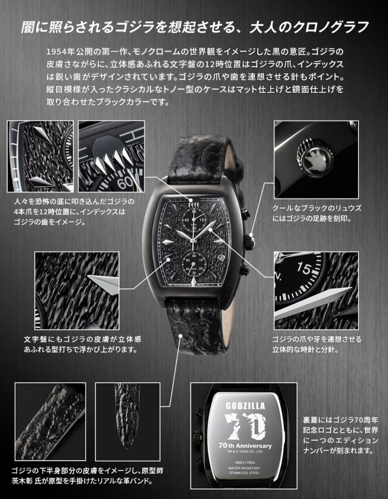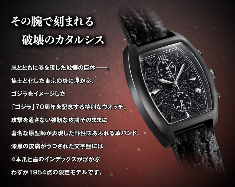 Godzilla 70th Anniversary Official Watch Limited Edition 2025 Limited Quantity Description About This Items Release date : July , 2025 Specifications Materials: ・Case and back cover: Stainless steel ・Band: Genuine leather ・Crystal: Mineral-reinforced glass Case Dimensions (approx.): 45mm x 34mm x 11mm (thickness) Wrist Size (approx.): Fits wrists 14.5cm to 19.5cm Movement: Quartz (average monthly accuracy ±20 seconds) Water Resistance: 3 ATM (suitable for daily use, splash resistant) Condition New Unopened 100% Authentic Shipping This is a pre-order. We will ship the goods after the release date. Shipping with tracking number. International Buyers - Please Note: We ship items from Japan . Import duties, taxes (example VAT, GST), and charges are not included in the item price or shipping cost. These charges are the buyer's responsibility. Please check in advance about those additional costs in your customs office before buying. Generally, those additional costs will be charged by the carrier when you receive the item. We write the customs declaration correctly. No undervalue. No checkmark gift. About Us Welcome to KAWAII's Shop! Hi there, I'm Himawari from Japan, the owner of this shop! We specialize in selling adorable and captivating items, including anime-related figures and stickers. Let your favorite kawaii things brighten up your room! Whether for your collection or as a gift, we have the perfect items for you. Our Policy Authentic Japanese Products: All items are sourced directly from Japan and are 100% genuine. Fast Shipping: We ensure quick and careful shipping. High-Quality Items: We only offer carefully selected, high-quality products. Excellent Customer Service: We respond promptly to any questions or requests. Enjoy Your Shopping! If You Have Any Questions, Please Feel Free To Contact Us. We Will Get Back To You As Soon As Possible.