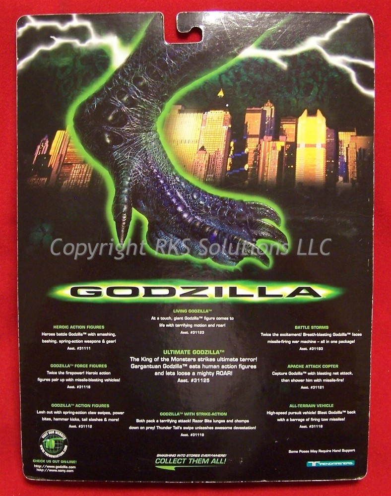 Godzilla 98 Ultra-Attack Animal Mortar Cannon&Grenade Launcher Trendmasters 1998 New on card - Trendmasters 1998 "Godzilla™" Ultra-Attack Animal. Produced in 1998. From the 31111 Heroic Action Figures collection: Heroes battle Godzilla™ with smashing, bashing, spring-action weapons & gear! This is from my personal collection, my 'reserve' piece should my display piece be damaged. It has been stored indoors, in a non-smoking, pet-free environment. The card and plastic are in good condition but do show some signs of storage. Terms and Conditions: These elongates are from my various personal collections - metal content is determined by weight. Elongated coins, most commonly pennies, are also known as "pressed", "rolled", "stretched", "flattened", "pinched", "smashed", and "squished", and are generally souvenirs from various tourist locations, facilities, or events. I use my own photos to show the actual patina, which will vary from coin to coin - what you receive should be accurately represented by what is in the photos. I do respond to all e-mails, normally within 24hrs or less. If you do not get a reply please check your Junk Mail folder and any anti-spam settings. This is the number one reason for e-mail problems. I'm happy to combine your items , whenever possible. Please contact me for details before purchasing . Feedback: If there are any problems, please contact me before leaving feedback - most problems can be easily resolved. I consider your positive feedback as your acceptance of the item sold and the completion of the transaction. I do leave feedback for all buyers. Payment Information: Please ensure payment is made within 4 days of the end of the auction. I accept most payment forms allowed by eBay - please contact me before purchasing if you have any questions. Sales Tax: eBay is now collecting your state sales tax. Shipping & Handling: All coins are sent via USPS and are shipped within 24hrs of payment clearance. All shipping times are estimates and could be longer due to carrier delays. I do not ship outside the USA at this time And don't forget to add us to your Favorite Sellers list! Powered by SixBit's eCommerce Solution