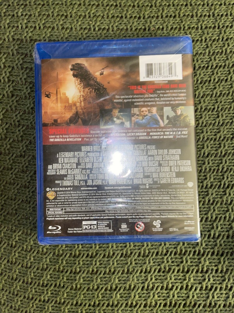 Godzilla Blu-Ray, 2014, NEW SEALED is a standard edition Blu-ray movie in NTSC video format. Directed by Gareth Edwards, it features actors Ken Watanabe, Elizabeth Olsen, Aaron Taylor-Johnson, and Juliette Binoche. The film is in English with subtitles available in English, French, and Spanish. It has a PG-13 rating, a run time of 123 minutes, and is in widescreen format with an aspect ratio of 16:9. Produced by various individuals, this action & adventure film was released by Warner Bros in 2014.