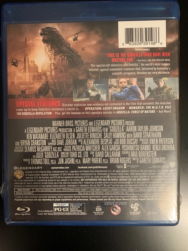 Godzilla (Blu-Ray) DISC ONLY Aaron Taylor-Johnson Ken Watanabe Elizabeth Olsen Hi, I'm Jamie your friendly online DISC ONLY seller. All discs are cleaned before being shipped or bought brand new. This one is brand new that has never been played but listed as like new as it has been removed from the original packaging. They are mailed inside a disc cover and a cardboard envelope first class with a stamp from my home to your home. Please allow up to 10 days for delivery from the shipped date. Here at Bluegrass Values and Bookstore we offer free 60 day returns. If you encounter any issues with your disc media feel free to reach out to me, and I will make it right and resolve any issue you may have. Keep on spinning your discs.
