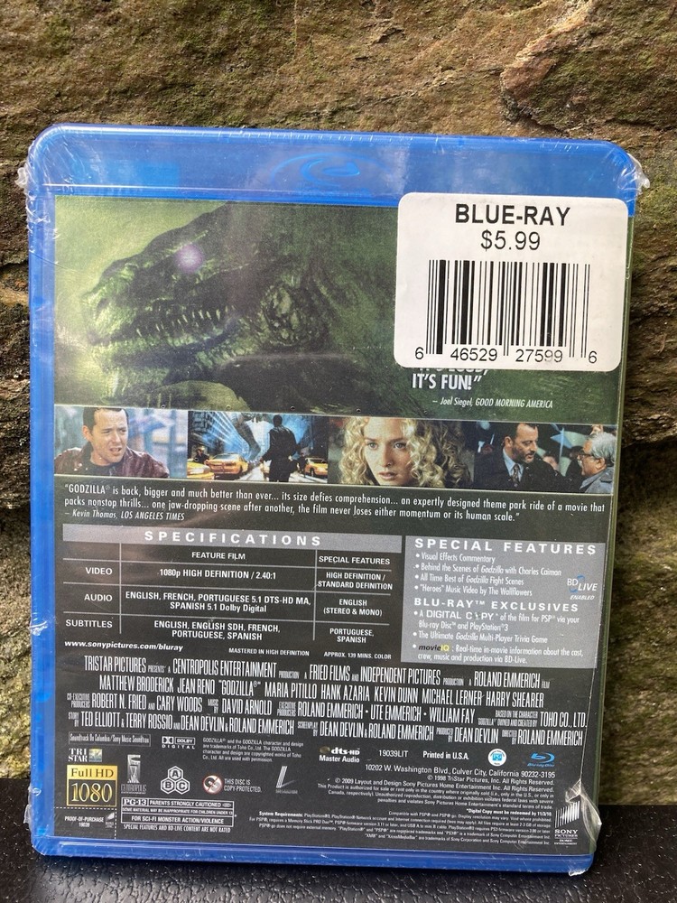 The product is the sealed Blu-ray 1998 movie release of Godzilla starring Matthew Broderick. It includes special features such as English, French, and Spanish subtitles, and is region coded for Blu-ray players in Americas and Southeast Asia. Directed by Roland Emmerich and produced by Godzilla, this sci-fi and fantasy film falls under the sub-genre of Creatures/Monsters, with P-Diddy providing music. The Blu-ray format and NTSC video format ensure high-quality viewing experience for fans of the Godzilla franchise.