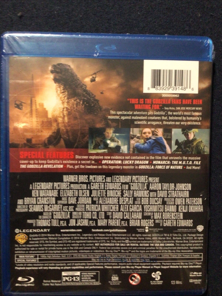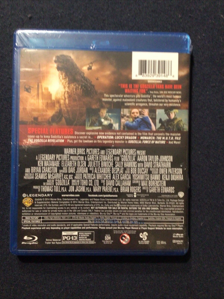 Brand NEW and SEALED with some Embark on a thrilling journey with the 2014 blockbuster "Godzilla" on Blu-ray, a cinematic experience that brings the epic battle between the iconic monster and an array of creatures to your home screen. This Standard Edition comes in a sleek Blu-ray case, ensuring your movie is stored in style. The film boasts a widescreen format, perfect for immersing yourself in the vivid visuals that bring the Sci-Fi & Fantasy genre to life. With audio options including English, Spanish, and French subtitles, this movie is accessible to a wide audience. Dive into the action with a PG-13 rating and enjoy a film that's sure to become a classic in the monsters-and-creatures sub-genre.