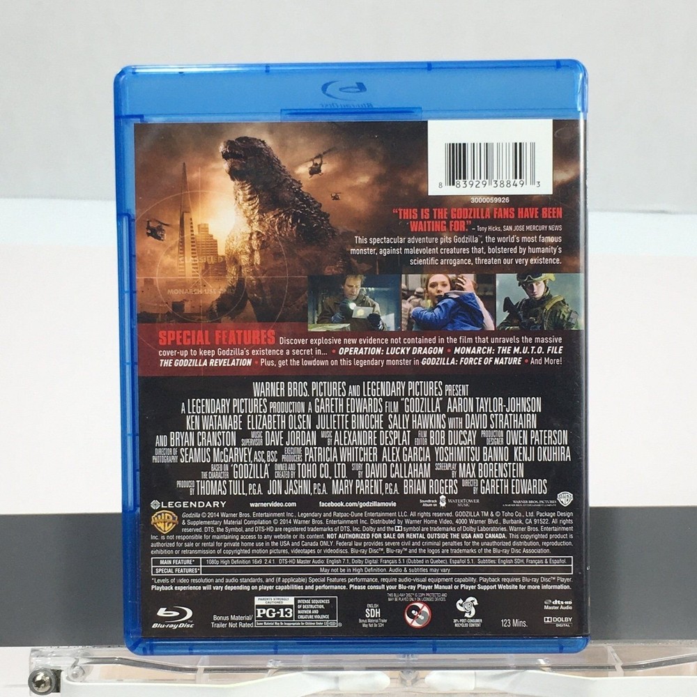 Ford Brody (Aaron Taylor-Johnson), a Navy bomb expert, has just reunited with his family in San Francisco when he is forced to go to Japan to help his estranged father, Joe (Bryan Cranston). Soon, both men are swept up in an escalating crisis when Godzilla, King of the Monsters, arises from the sea to combat malevolent adversaries that threaten the survival of humanity. The creatures leave colossal destruction in their wake, as they make their way toward their final battleground: San Francisco. FODDER & SUNS Thank you for visiting our store! Please be assured that we clean and inspect every item available to the best of our ability. Any defects or special features are noted either in pictures and/or the listing condition. We offer returns on most items except those that are for parts or repairs. Please review the listing carefully and ask any questions before purchase. Follow our store for new items added daily as well as special offers and coupons! We appreciate your business. Thanks for looking!