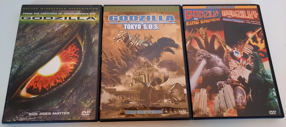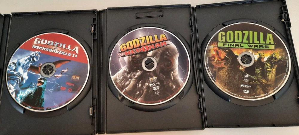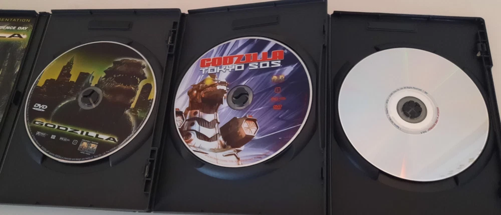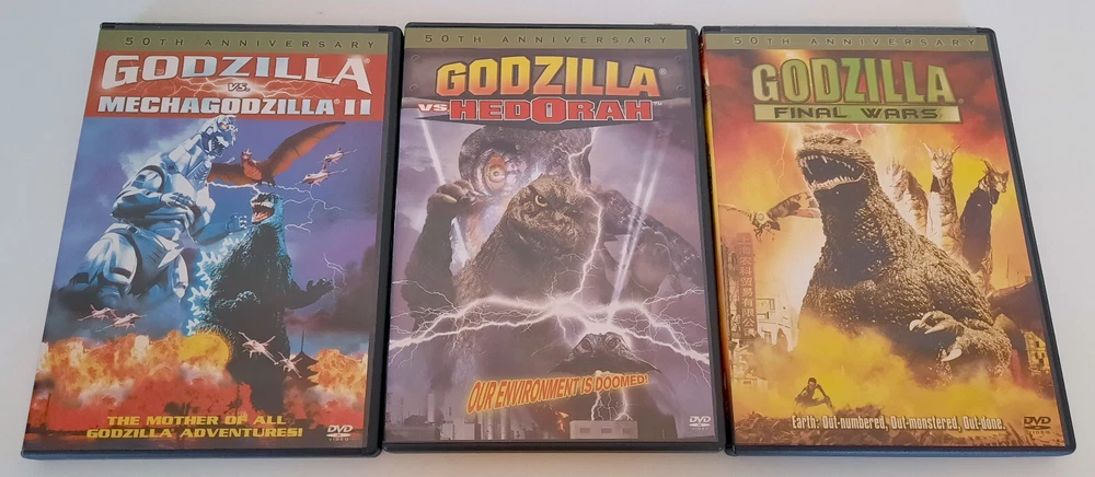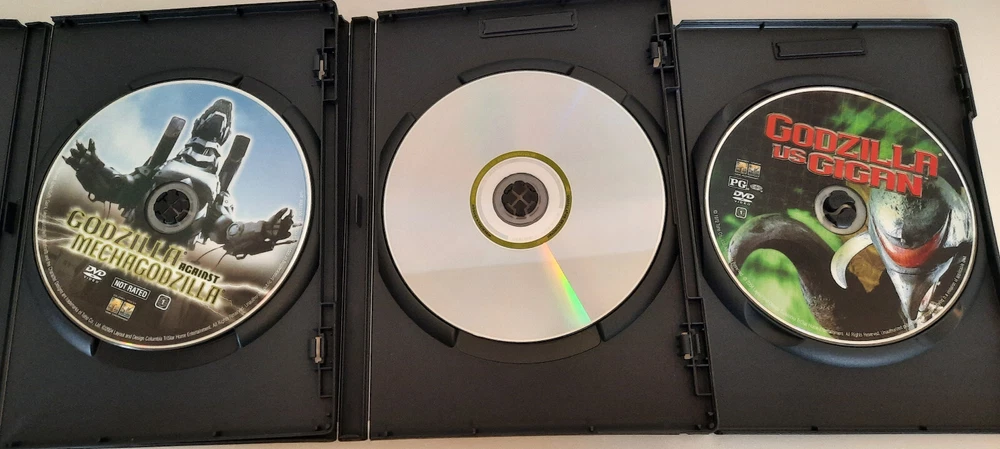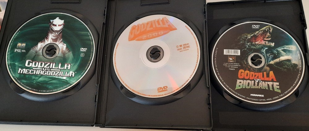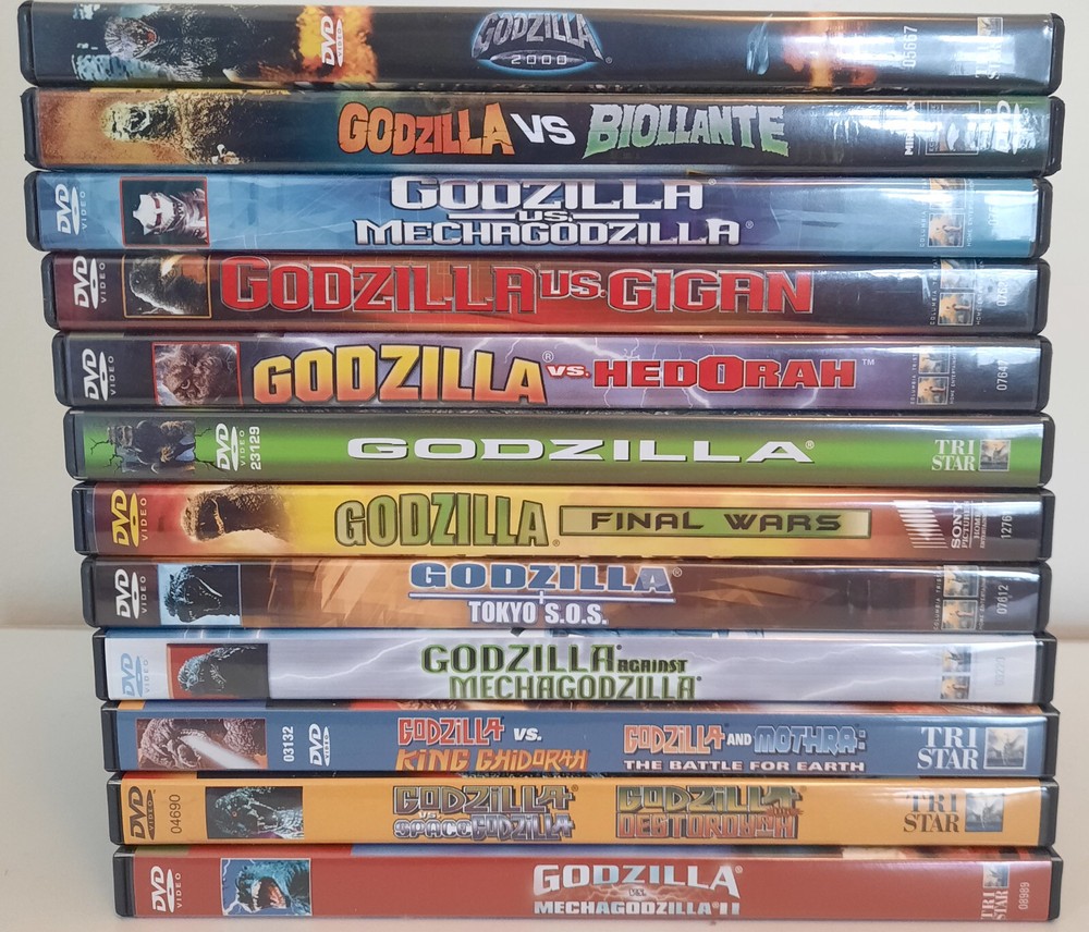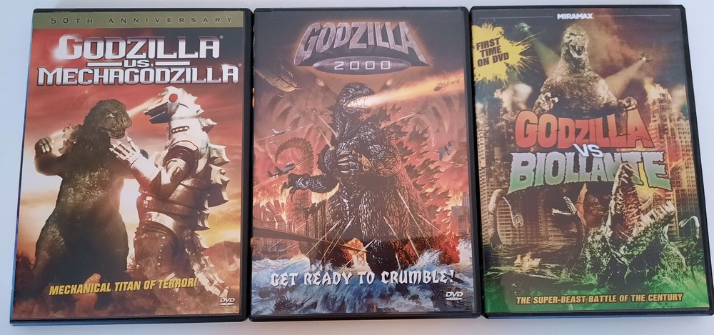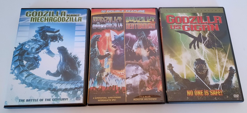 Godzilla DVD Lot of 12 Discs/14 Movies Showa Era: - Godzilla vs. Hedorah (1971) -- Region 1, Japanese/English - Godzilla vs. Gigan (1972) -- Region 1, Japanese/English - Godzilla vs. Mechagodzilla (1974) -- Region 1, Japanese/English Heisei Era: - Godzilla vs. Biollante (1989) -- Region 0, Japanese/English - Godzilla vs. King Ghidorah (1991) / Godzilla and Mothra: The Battle for Earth (1992) -- Region 1, English - Godzilla vs. Mechagodzilla II (1993) -- Region 1, Japanese/English - Godzilla vs. Space Godzilla (1994) / Godzilla vs. Destroyah (1995) -- Region 1, English Millennium Era: - Godzilla 2000 (1999) -- Region 1, English/French - Godzilla Against Mechagodzilla (2002) -- Region 1, Japanese/English - Godzilla Tokyo S.O.S. (2003) -- Region 1, Japanese/English - Godzilla Final Wars (2004) -- Region 1, Japanese/English Tristar: - Godzilla (1998) -- Region 1, English Ships within 3 business days (typically on Wednesdays and Fridays) From a smoke-free, pet-free home