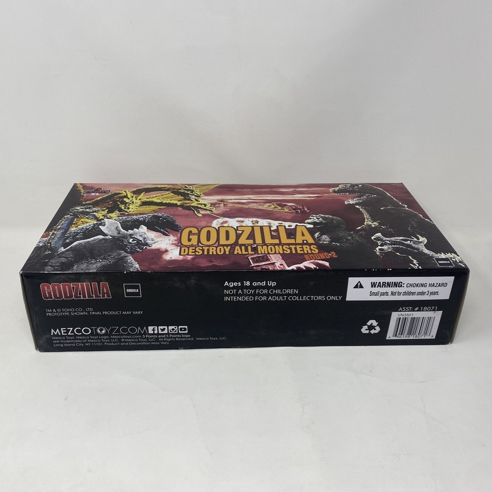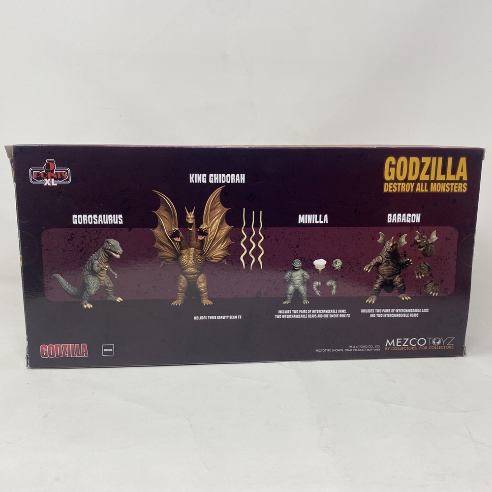Get ready to relive the epic battles of the 1968 movie, Godzilla Destroy All Monsters, with this amazing boxed set from Mezco. This highly detailed action figure set features all your favorite characters including Gorosaurus, Minilla, King Ghidorah, and Baragon. Made from high-quality plastic with a 1:18 scale, these figures are perfect for collectors and fans of the Godzilla franchise. Recreate your favorite scenes from the movie or add these incredible figures to your collection. With features like boxed packaging, collector's edition status, and an age level of 18 years and up, this is an item you won't want to miss. So, join the excitement and add this Mezco Godzilla Destroy All Monsters boxed set to your collection today!
