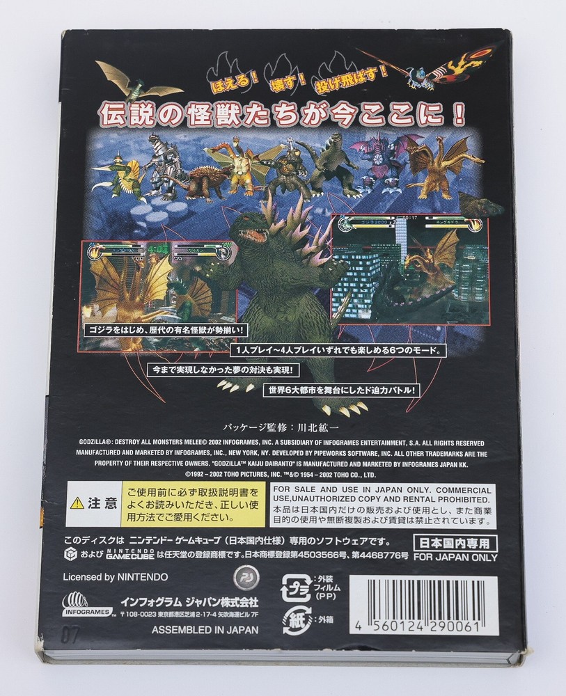 Description Up for auction is a used "Godzilla Destroy All Monsters Melee" for the Nintendo GameCube system. This is the Japanese release of the game, released for the GameCube in Japan. It is region coded and requires a NTSC-J system to play or a system that can play any region games. It is an official Nintendo game made in Japan. The outer box shows light-to-moderate signs of wear, overall in fairly good condition. The instruction manual is a bit crinkly, in fairly good condition overall. The game disc itself is in very good condition with minimal signs of use/wear (see photos for more detail about condition). The game is tested and working. About Us Thanks for checking out our eBay auctions. We primarily sell new and used video games as well as video game related accessories and merchandise from Asia. The items in the shop will be shipped from Taipei, Taiwan. Your feedback is always appreciated and hope you have a pleasant time dealing with us. If you have any questions, comments or concerns please feel free to contact us. Thank you! Shipping Asia USA Europe Australia & New Zealand Standard About About About About Delivery Time 5-14 Days 8-18 Days 10-24 Days 10-21 Days EMS About About About About Delivery Time 2-8 Days 4-12 Days 4-14 Days 4-12 Days Please note that delivery times are approximate and items may take longer to arrive than stated above. Estimates shown are in business days (Monday-Friday). Prices include both shipping and packaging fees. Almost all items are shipped in boxes with bubble padding. We do combine shipping eBay should automatically calculate the combined shipping for most items in the shop. If there's any issue with checking out with a combined shipping discount, please send us a message. Combined shipping prices are based on the highest shipping price plus: Loose cartridge (Famicom, Super Famicom, Sega MD) - $2.00 each Loose cartridge (N64, NES) - $3.00 each Boxed Games (Famicom, Super Famicom, Sega MD) - $4.00 each Boxed Games (N64, NES) - $5.00 each Loose Neo Geo AES and MVS Cartridge - $7.50 each Boxed Neo Geo AES and MVS - $10.00 each If you have any questions related to shipping. Please contact us and we'll get back to you ASAP. Terms and Conditions We always strive to provide the best service possible and are constantly working hard to offer the best products and bidding experience that we can. We provide high-quality high-resolution photos of all our items so please look closely and bid confidently. Items are usually shipped within 48 hours (Excluding weekends and holidays) Please contact us if you feel the item you received differs significantly from the photos or description provided (All photos are of the the actual item up for bid). We try to our best to describe all our items with the utmost accuracy