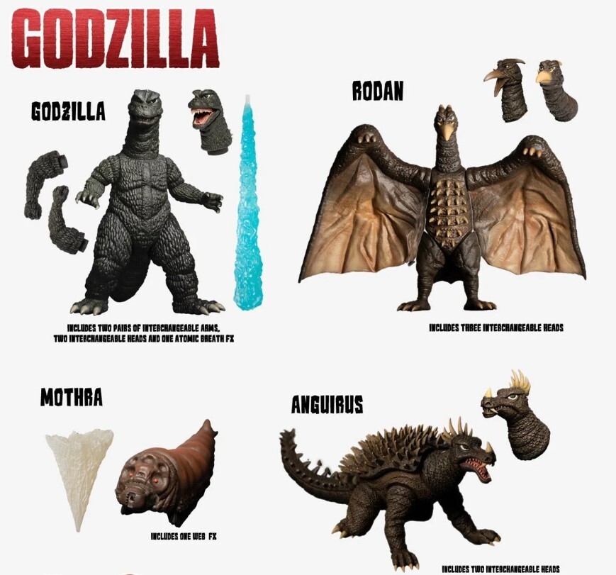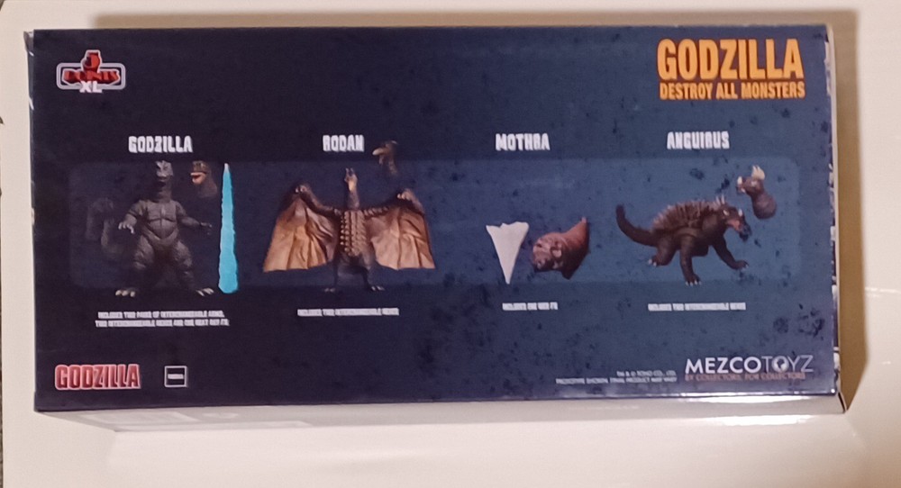 Godzilla: Destroy All Monsters (1968) 5 Points XL Round 1 Boxed Set: 5 Points XL Godzilla: Destroy All Monsters (1968) - Round 1 Boxed set 5 Points XL - a colossal addition to The nostalgic 5 Points line with the same fan-fueled fun, but bigger! …It's a little bit of a big deal. The monsters are in revolt…and the world is on the brink of destruction! Inspired by the 1968 film, this colossal crate of kaiju can barely contain the beasts of Monsterland - Godzilla, Mothra, Anguirus, and Rodan! The Godzilla: Destroy All Monsters (1968) 5 Points XL Round 1 Boxed Set includes: Godzilla – King of the Monsters! 4 1/2-inch tall Godzilla comes with a pair of alternate arms, an alternate head portrait, and his signature atomic breath FX that attaches to one of his head portraits. Mothra – The giant moth goddess is depicted in her larval stage. 1 1/2-inch tall Mothra comes with a web FX that attaches to her mouth. Anguirus – Friend or foe? This 3 1/8-inch tall five-brained burrowing Kaiju comes with an alternate closed-mouth head portrait. Rodan – Irradiated Pteranodon and flying menace! 4 1/2-inch tall Rodan comes with an alternate closed-mouth head portrait. Accessories included: 2x pairs of Godzilla arms 2x Godzilla head portraits 1x Godzilla atomic breath FX 1x Mothra web FX 2x Anguirus head portraits 2x Rodan head portraits 2x display bases 5 Points XL Godzilla: Destroy All Monsters (1968) - Round 1 Boxed set is packaged in a collector-friendly box, designed with collectors in mind.