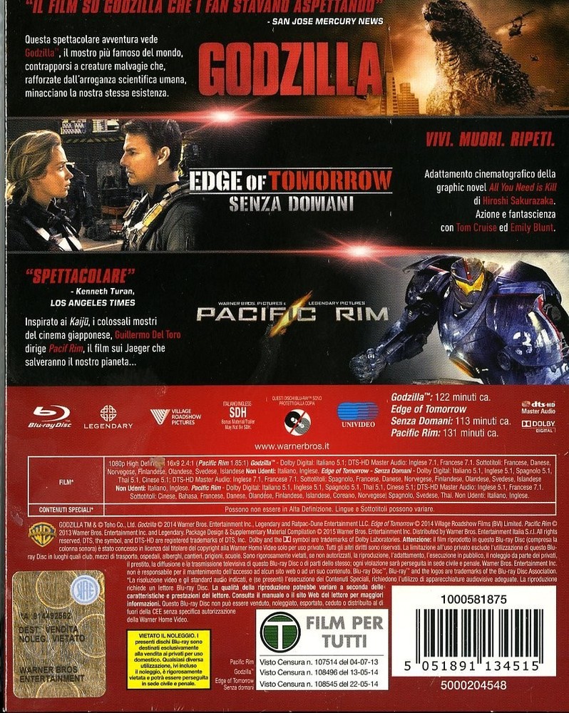 Further Details Title: Godzilla, Edge Of Tomorrow, Pacific Rim (Box 3 Br) Condition: New Description: DESCRIZIONE PRODOTTO blu-ray EAN: 5051891134515 Actor: Cruise, Blunt, Gleeson, Adams, Watanabe, Hunnam, Olsen, Elba, Cruise, Blunt, Gleeson, Adams, Watanabe, Hunnam, Olsen, Elba Format: Blu-ray Genre: Thriller No Of Discs: 3 Run Time: 8 ore e 20 minuti Studio: WARR1 Region Code: Blu-ray: B (Europe, AU, NZ, Africa...) Language: Italian Missing Information? Please contact us if any details are missing and where possible we will add the information to our listing.