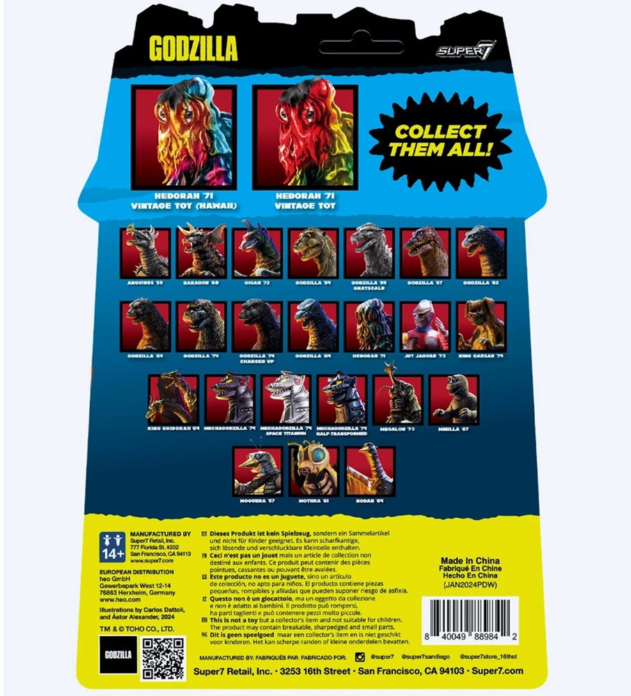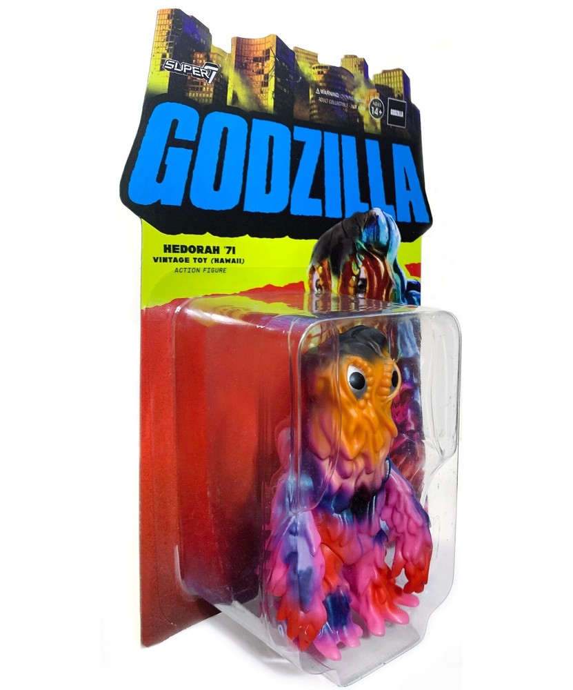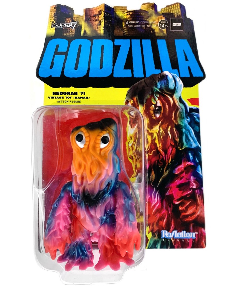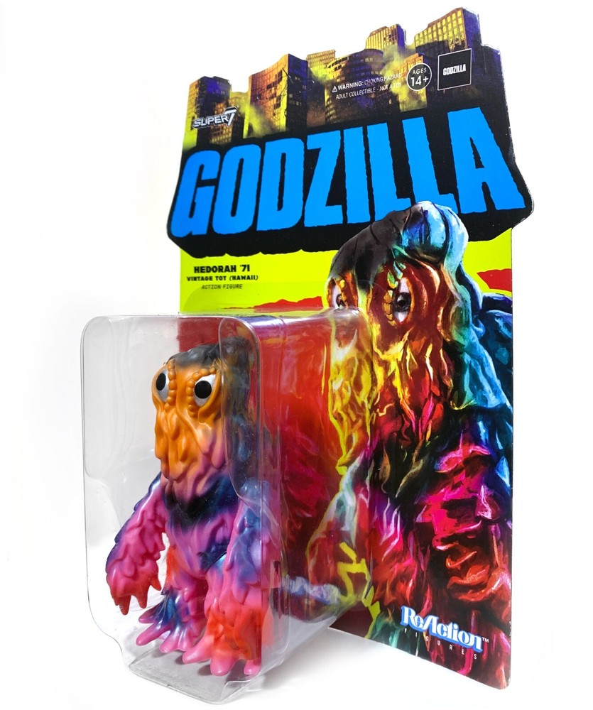 HEDORAH '71 HAWAII TOY VERSION 4.5-INCH TOHO ReACTION FIGURE SAN DIEGO COMIC CON EXCLUSIVE by Super7 Based on the 1971 Toho film Godzilla vs. Hedorah (AKA Godzilla vs. the Smog Monster) and inspired by the vintage, different-coloured Japanese toys exported to Hawaii in the '70s, Comic Con 2024 Exclusive Toho ReAction Figure of Hedorah '71 features brilliant hues with metallic paint detailing. Hedorah stands approx. 4.5" tall with 4 points of articulation and comes packed on a blistered cardback. BRAND NEW, factory sealed on unpunched card.