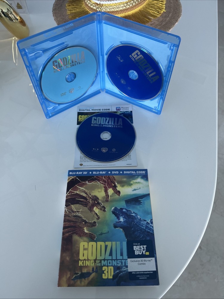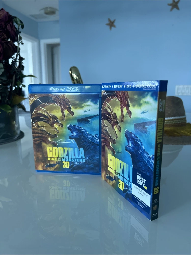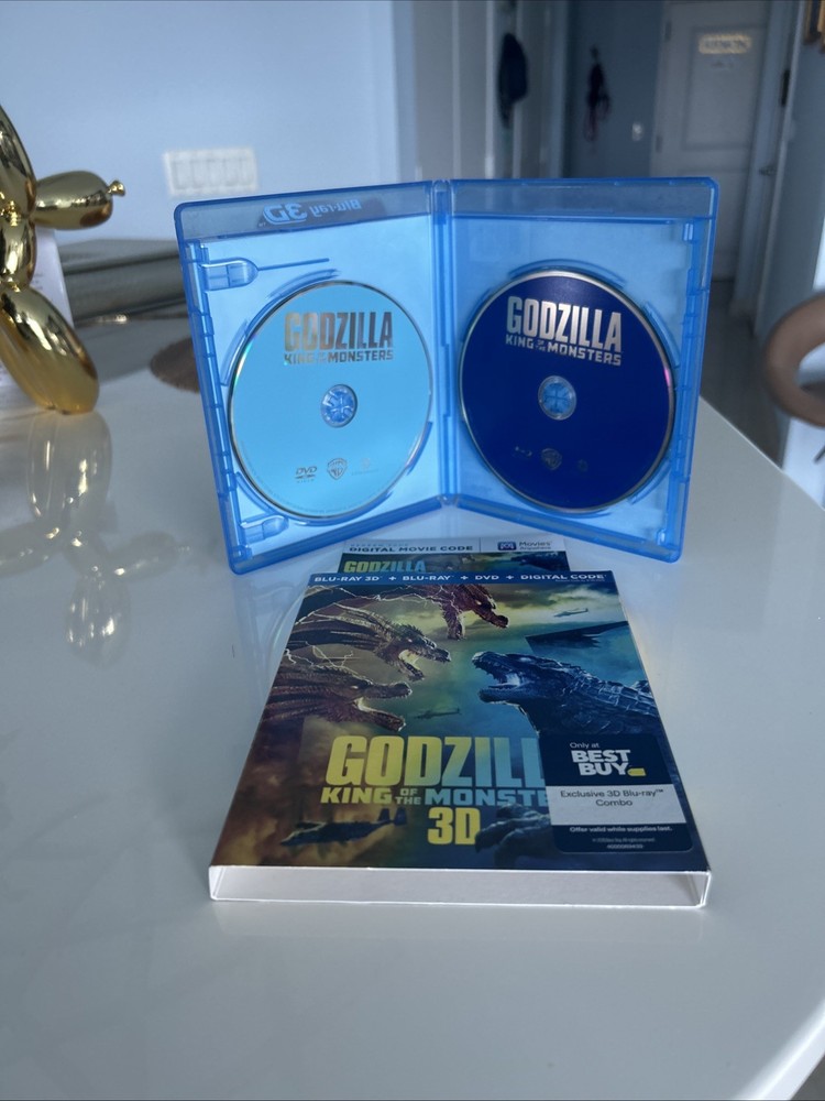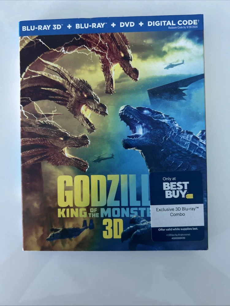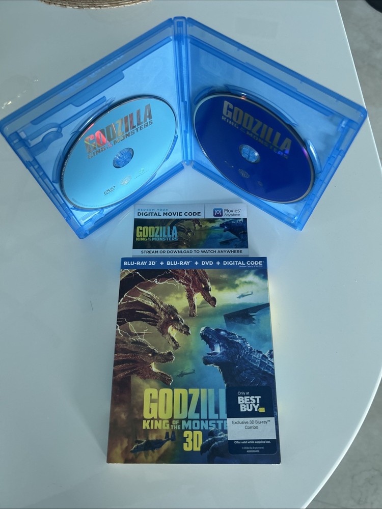 Godzilla: King of the Monsters (3D, Blu-ray, DVD, Digital, 2019) Best Buy Exclusive 3-Disc set including OOP, Rare Slipcover. All in pristine condition from a private collection. Watched Once. See pictures! This is a special edition 3-Disc Blu-ray of the 2019 monster movie "Godzilla King of the Monsters." The movie features a lot of great extra features, including commentary, deleted scenes, and behind-the-scenes featurettes. The disc includes both 2D and 3D versions of the movie, and the case is a Blu-ray case. The movie is rated PG-13 and has a run time of 132 minutes. It stars Kyle Chandler, Anthony Ramos, Millie Bobby Brown, Ken Watababe, Charles Dance, and Zhang Ziyi. The movie is in English, French, Portuguese, and Spanish, and has subtitles in those languages. The disc is region-free and has a 16:9 aspect ratio.