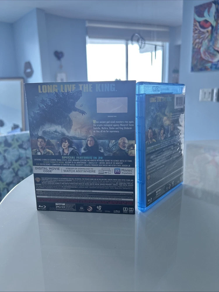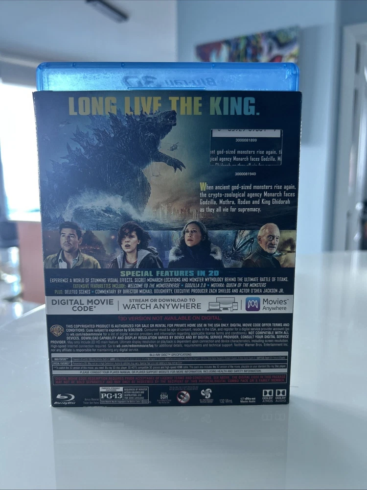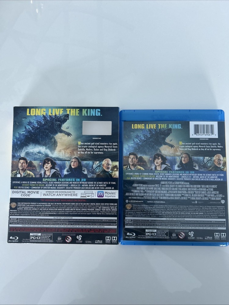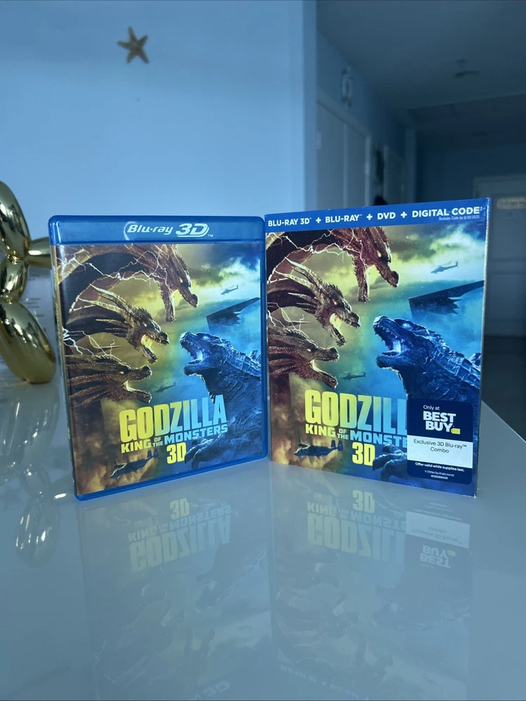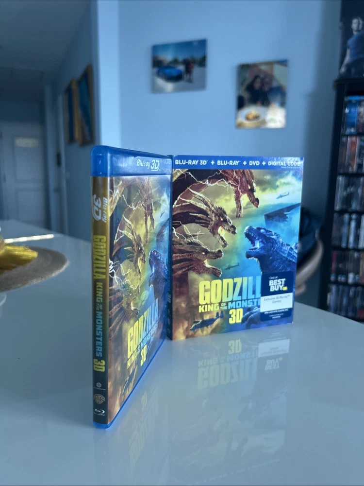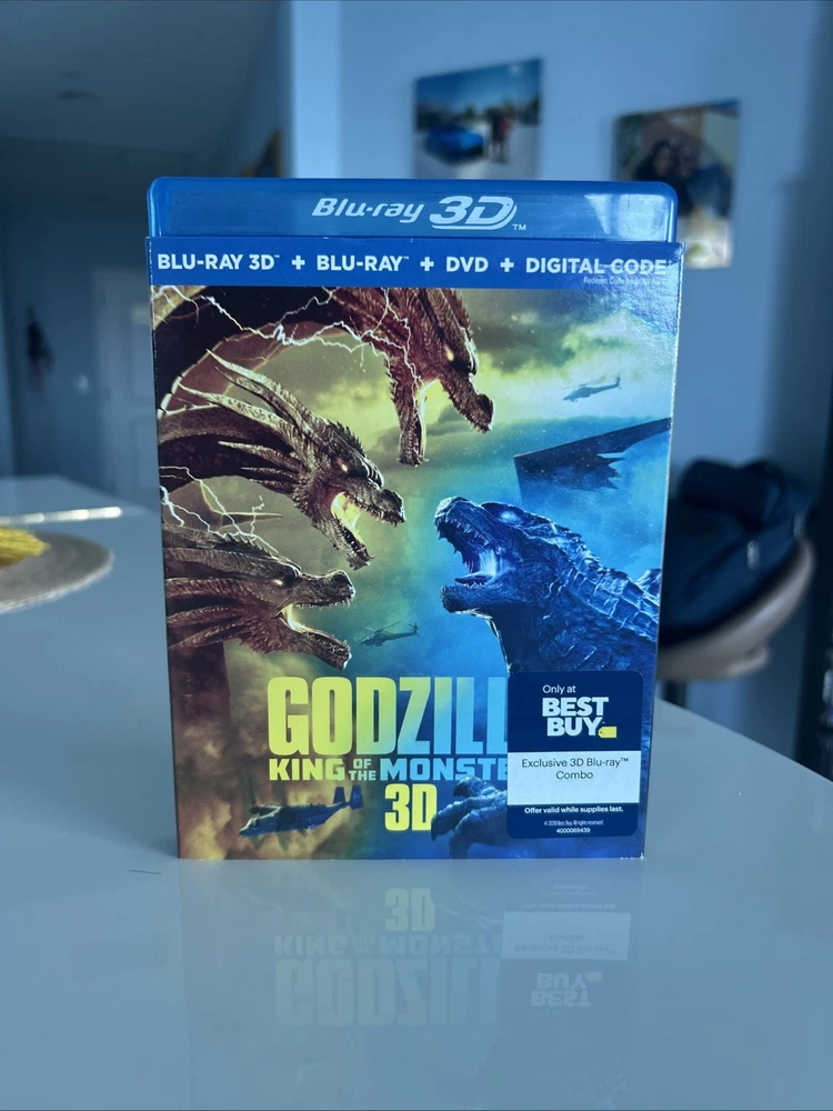 Godzilla: King of the Monsters (3D, Blu-ray, DVD, Digital, 2019) Best Buy Exclusive 3-Disc set including OOP, Rare Slipcover. All in pristine condition from a private collection. Watched Once. See pictures! This is a special edition 3-Disc Blu-ray of the 2019 monster movie "Godzilla King of the Monsters." The movie features a lot of great extra features, including commentary, deleted scenes, and behind-the-scenes featurettes. The disc includes both 2D and 3D versions of the movie, and the case is a Blu-ray case. The movie is rated PG-13 and has a run time of 132 minutes. It stars Kyle Chandler, Anthony Ramos, Millie Bobby Brown, Ken Watababe, Charles Dance, and Zhang Ziyi. The movie is in English, French, Portuguese, and Spanish, and has subtitles in those languages. The disc is region-free and has a 16:9 aspect ratio.
