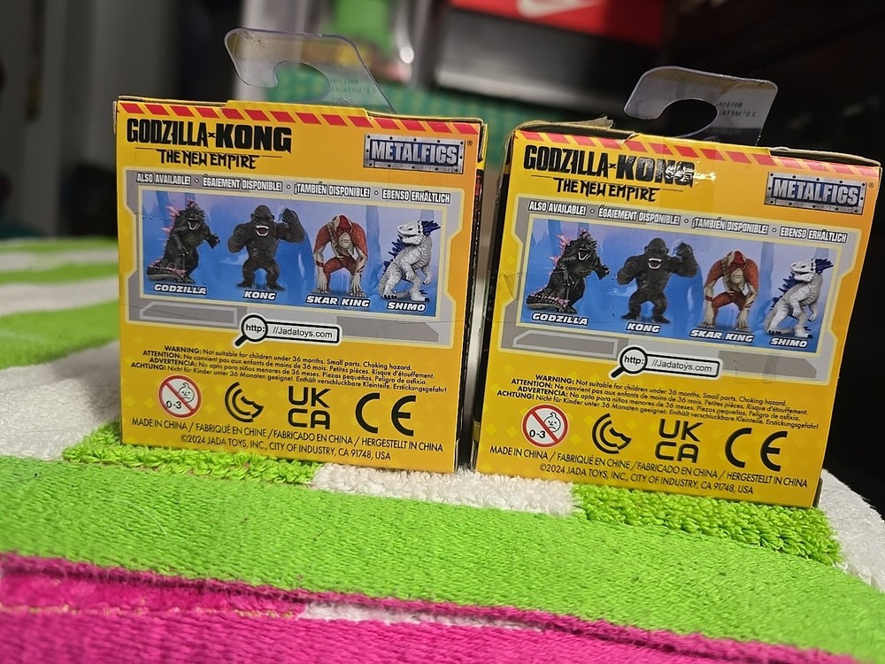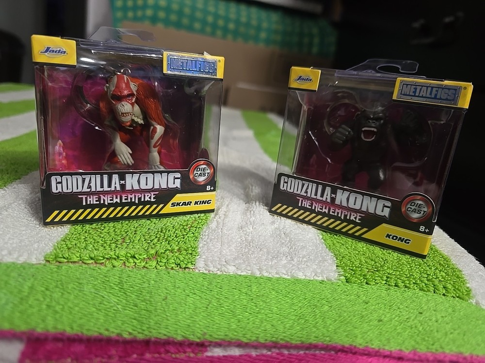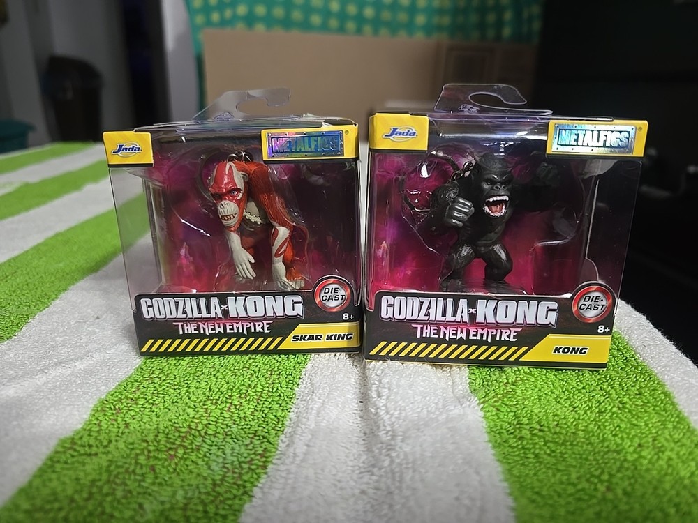 The Godzilla-Kong: The New Empire Jada Metal Figs Set of 2 includes action figures of Skar King and Kong from the popular animated movie. Made of die-cast material and measuring 2 inches in length, height, and width, these figures are part of the Godzilla franchise and are licensed by Jada Toys. With a colorful multicolor design and a 2024 manufacturing year, this set is suitable for children aged 8 to 11 years old and is an original licensed reproduction. Perfect for fans of the Godzilla X Kong: The New Empire movie and collectors of action figures.