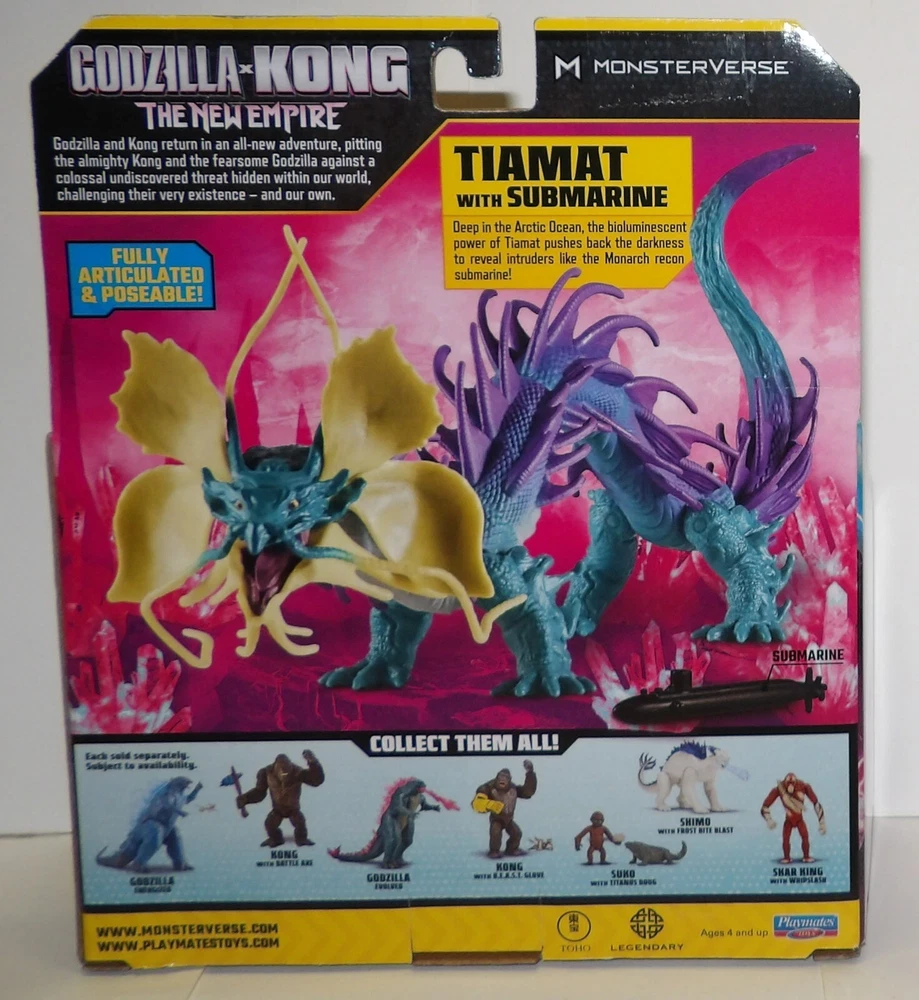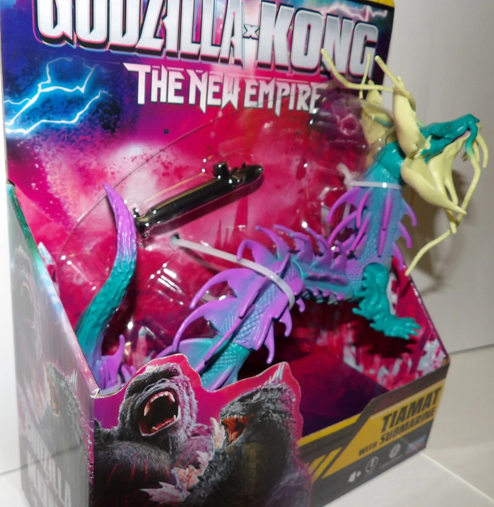 Embark on an epic adventure with the Tiamat action figure from the "Godzilla x Kong: The New Empire" series, presented by Playmates Toys. This meticulously crafted figure stands at 6 inches tall and depicts the formidable dragon-like creature in vibrant, multicolor detail, true to its appearance in the hit film. The set also includes a submarine accessory, adding depth to the collectible's appeal and allowing for imaginative play. As a limited edition piece, this Tiamat action figure is a must-have for fans and collectors alike. It features adjustable features for dynamic posing and comes boxed, making it an ideal display item. With its origins from the renowned Universal Animation Studios and the official Godzilla franchise, it's a unique addition to any collection of movie memorabilia or action figures.