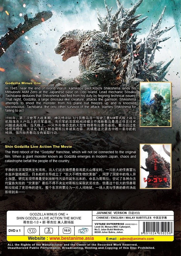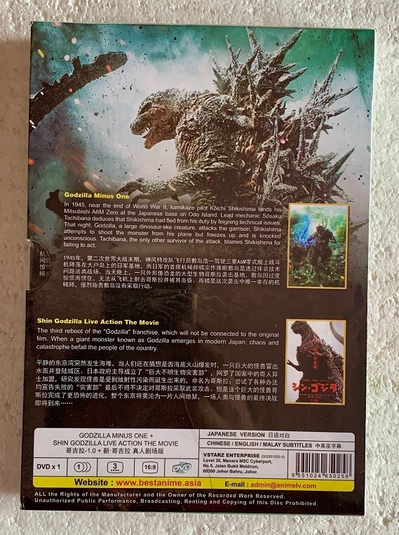 Title Name: Godzilla Minus One [2023] + Shin Godzilla [2016] Movie Audio: Japanese Subtitle: English /Chinese/Malay Region: All Region, Free Code Screen: 16:9 Disc Type: DVD x1 Series Type: Movie Genres: Action, Sci-Fi 1) Godzilla Minus One [2023] Starring: Ryunosuke Kamiki, Minami Hamabe, Yuki Yamada, Munetaka Aoki, Hidetaka Yoshioka, Sakura Ando, Kuranosuke Sasaki Running time: 125 minutes 2) Shin Godzilla [2016] Starring: Hiroki Hasegawa, Yutaka Takenouchi, Satomi Ishihara Running time: 120 minutes Malaysia authentic DVDs. All items will be securely packed. Shipping & Handling: Order will ship within 1-3 working days via registered mail. Delivery takes 14-21 days. Import duties shall be borne by the buyer. Return Policy: Return accepted within 14 days. Return shipping cost shall be borne by the buyer. Contact Us/ Feedback Please do not hesitate to contact us if you have any queries or issues occurring, We are always here to assist. Thank you.