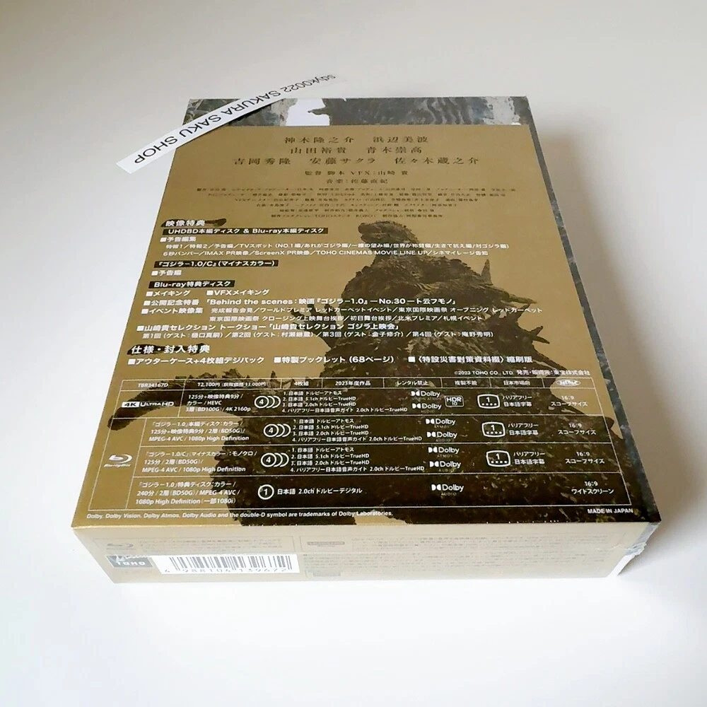Godzilla Minus One Deluxe Edition 4K UHD Blu-ray + 3BD Region free Godzilla-1.0 Description New Title: Godzilla Minus One Deluxe Edition 4K Ultra HD Blu-ray Product Type: 4K UHD Blu-ray, 3Blu-ray (Region: free) Number of Discs: 4 Director: Takashi Yamazaki Writer: Takashi Yamazaki Starring: Ryunosuke Kamiki, Minami Hamabe, Munetaka Aoki, Hidetaka Yoshioka, Sakura Andô, Kuranosuke Sasaki Producer: Kenji Yamada Color: Color Running Time: 125 minutes Original Release Year: 2023 Aspect Ratio(s) 16:9 Scope Subtitles: Japanese Subtitles for the Hearing Impaired Audio Track: Japanese Dolby Atmos, Japanese Dolby TrueHD 2.0ch, Japanese Dolby TrueHD 5.1ch, Japanese Audio Guide for the Visually Impaired Dolby TrueHD 2.0ch 4K UHD Blu-ray release of "Godzilla Minus One (Godzilla -1.0)", a 2023 Japanese sci-fi action film directed, written, and with visual effects by Takashi Yamazaki. It is Toho's 33rd Godzilla film and stars Ryunosuke Kamiki. In the film, postwar Japan deals with the emergence of Godzilla... [Spec/Bonus] - 4-disc digipak + Outer case - Special booklet - <Special disaster countermeasure materials> Reduced edition [Contents] Disc 1: 4K Ultra HD Blu-ray Disc 2: Blu-ray Disc 3: Blu-ray: Godzilla Minus One/C (black-and-white version) Disc 4: Blu-ray: Bonus Disc (making-of, VFX making-of, promotional TV special "Behind the scenes - No.30 - To Iu Mono," and event footage collection) [Trailer collection (Disc 2)] - Special News 1・2 - Trailer - TV spot - 6 seconds bumper - IMAX PR video - ScreenX PR video - TOHO CINEMAS MOVIE LINE UP - Cinemileage announcement *Ultra HD Blu-ray player is necessary to play this Ultra HD Blu-ray disc. Please note that it will not play on regular Blu-ray player. For optimal viewing experience of 4K UltraHD content, 4K/HDR TV is recommended, although it is also compatible with 4K TV and HV TV. Payment Please pay within 5 days after the auction closed. We will ship the item within 5 business days after your payment clears. Shipping This item will be shipped from JAPAN. Please check the shipping method in the Shipping Policy for that item. If you have any questions, please contact us anytime. About other areas, please ask us. Returns Returns are accepted ONLY if the item was not the item described. International Buyers - Please Note: * Import duties, taxes, and charges aren't included in the item price or postage cost. These charges are the buyer's responsibility. "Please check with your country's customs office to determine what these additional costs will be prior to bidding or buying. * We do not mark merchandise values below value or mark items as "gifts" - US and International government regulations prohibit such behavior. Thank you for your understanding in advance.