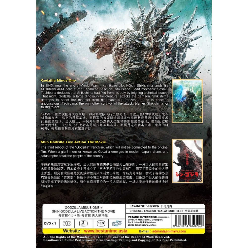 Godzilla Minus One + Shin Live Action Movies English Subtitle All Region DVD Product Descriptions : No of Disc: 1 Disc Version: Japanese Subtitles: English/Chinese/Malay Format: DVD (Widescreen 16:9) Genres: Action, Sci-Fi Godzilla Minus One [2023] Starring: Ryunosuke Kamiki, Minami Hamabe, Yuki Yamada, Munetaka Aoki, Hidetaka Yoshioka, Sakura Ando, Kuranosuke Sasaki Running time: 125 minutes Shin Godzilla [2016] Starring: Hiroki Hasegawa, Yutaka Takenouchi, Satomi Ishihara Running time: 120 minutes Story: In 1945, near the end of World War II, kamikaze pilot Kōichi Shikishima lands his Mitsubishi A6M Zero at the Japanese base on Odo Island. Lead mechanic Sōsaku Tachibana deduces that Shikishima had fled from his duty by feigning technical issues. That night, Godzilla, a large dinosaur-like creature, attacks the garrison. Shikishima attempts to shoot the monster from his plane but freezes up and is knocked unconscious. Tachibana, the only other survivor of the attack, blames Shikishima for failing to act. Payment Currently we accept payment through eBay managed payment. Shipping Handling time is 3-5 working days.Your goods will be shipped with a valid tracking number. All products are packed and layered with bubble wrap to reduce damages during shipment. Remote Areas and Additional Charges: For orders shipping to remote or less accessible locations, there may be additional shipping charges based on the postal code. We will promptly contact you to confirm any applicable charges to your specific area. Returns If you have any problem with the order,do contact via eBay message.We are glad to assist you and solve the problem as soon as possible. Other Import duties,taxes and additional charges are not included in the item price or shipping charges.Please be aware this custom import duties and taxes are buyer's responsibility. Contact Send us a message