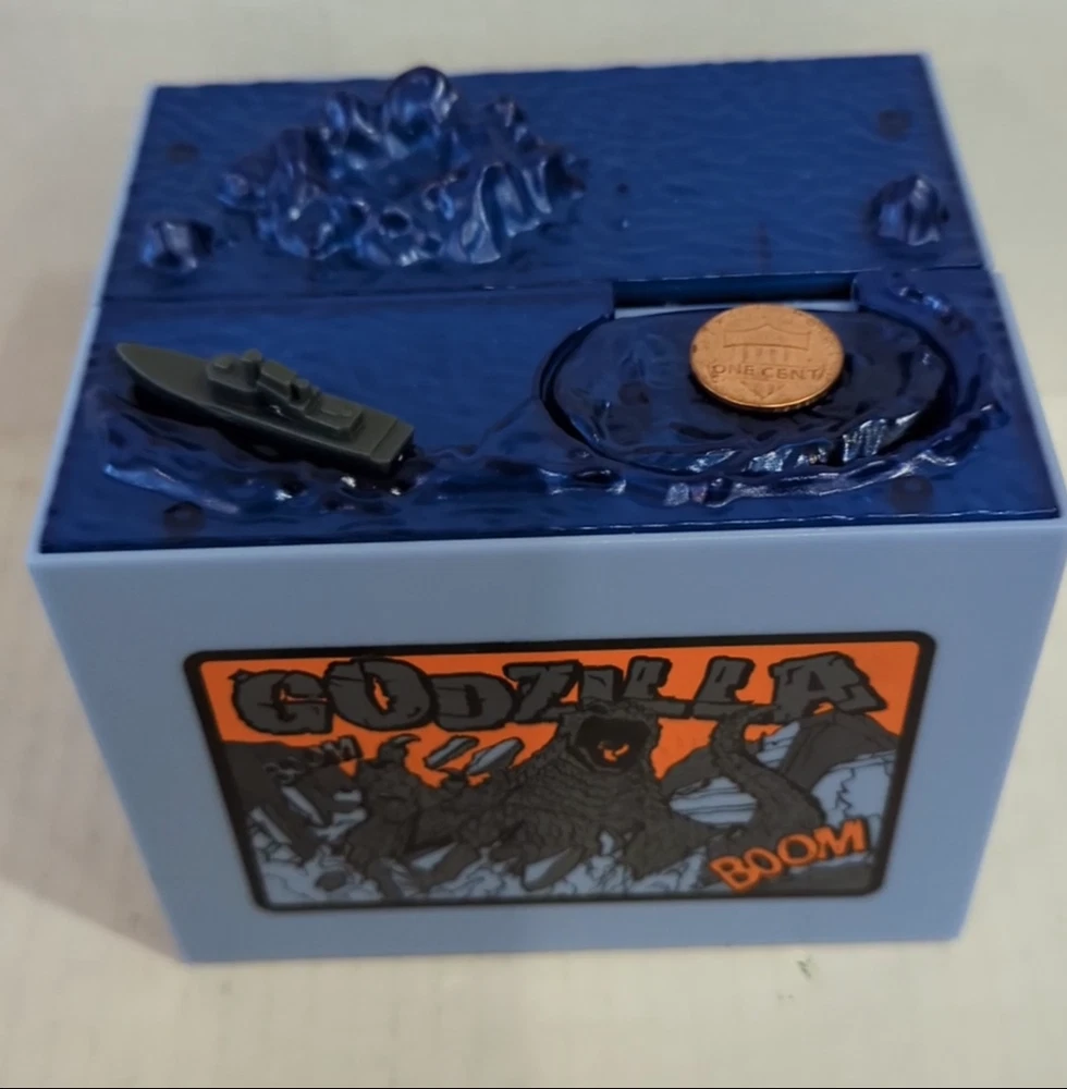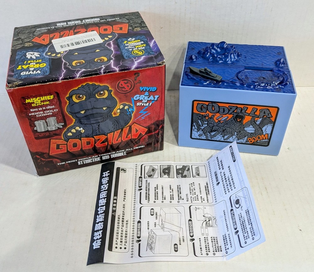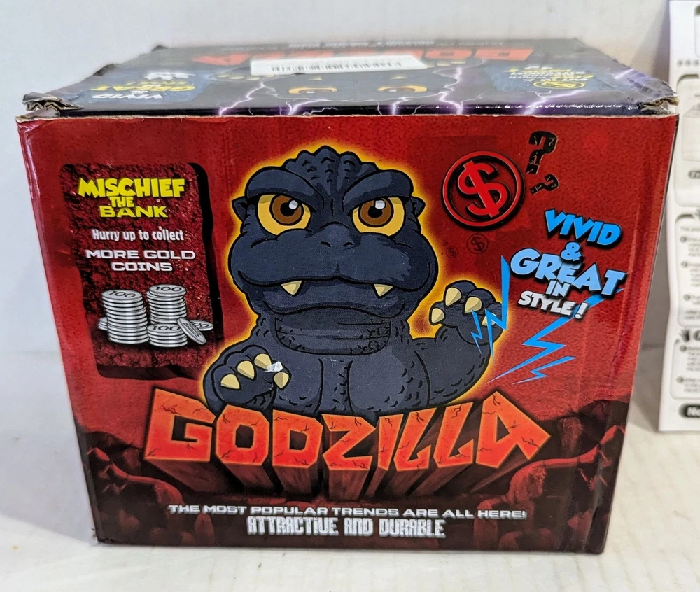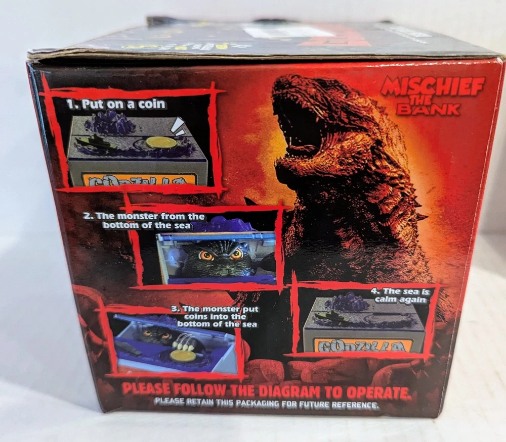 This is a Godzilla themed coin bank toy. It features an animated figure of Godzilla with LED lights and sound effects. Recommended for children aged 6 and up, this toy is designed to entertain with its mischief. The box is included, making it perfect for collectors or fans of the iconic monster. New in open box, requires 2 double A batteries not included.