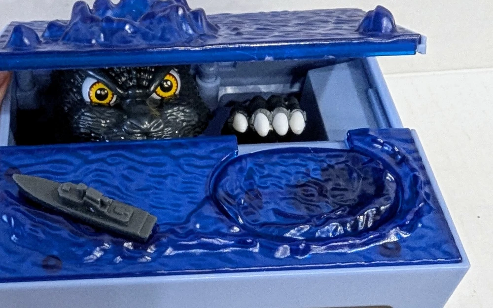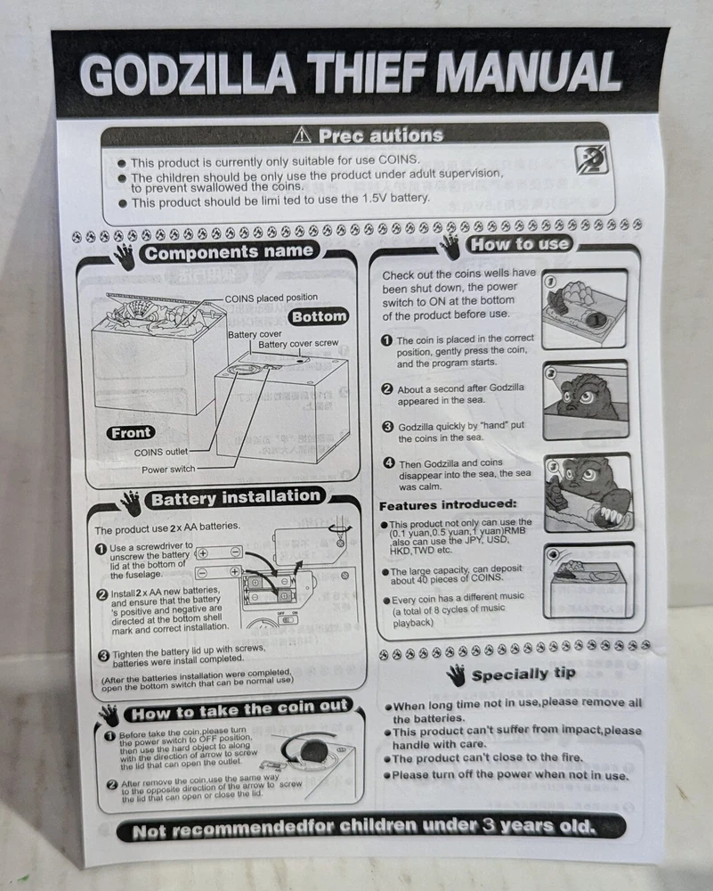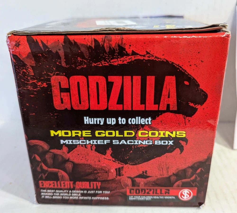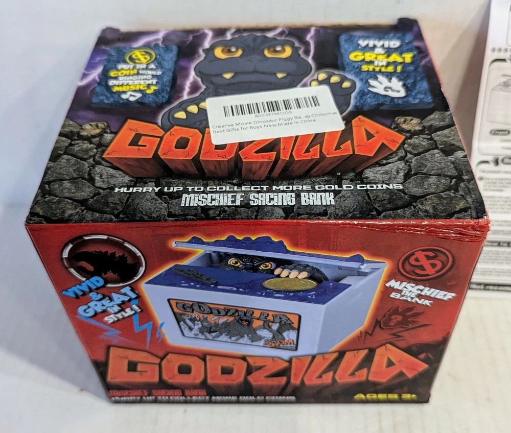 This is a Godzilla themed coin bank toy. It features an animated figure of Godzilla with LED lights and sound effects. Recommended for children aged 6 and up, this toy is designed to entertain with its mischief. The box is included, making it perfect for collectors or fans of the iconic monster. New in open box, requires 2 double A batteries not included.