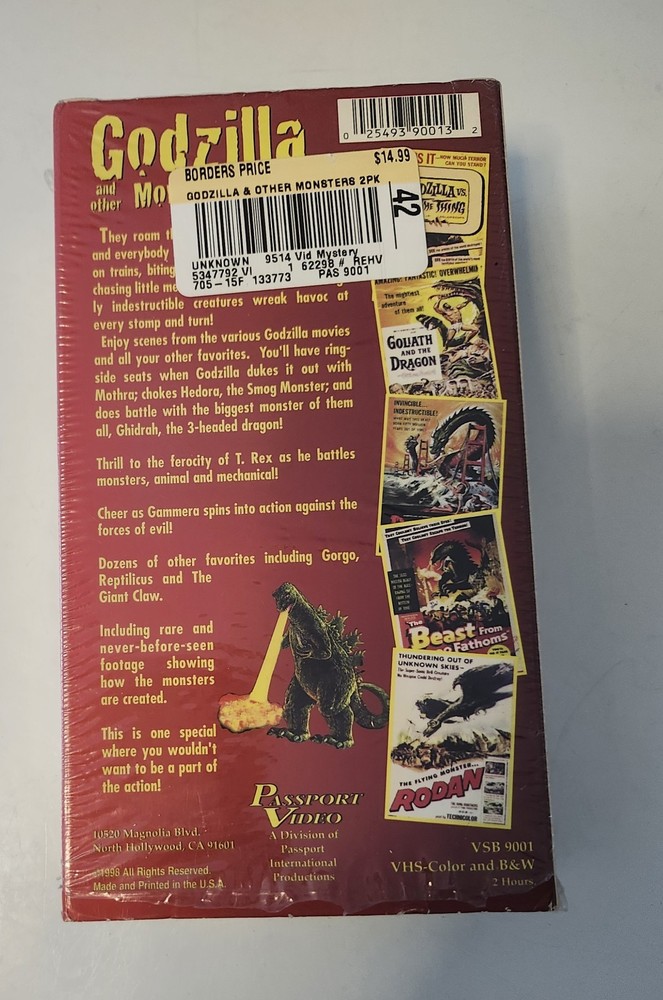 The product is a VHS tape from 1998 titled "Godzilla & Other Movie Monster," falling under the genre of Science Fiction. This box set includes the iconic monster Godzilla along with other movie monsters, providing entertainment for fans of the franchise. Produced by Passport, this VHS tape allows viewers to enjoy a collection of classic science fiction films featuring some of the most beloved creatures.
