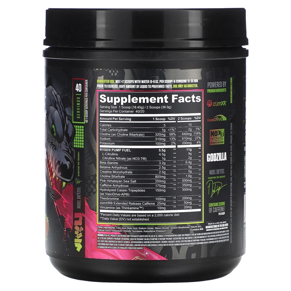 Fuel Your Greatness™ Ryse Up™ Supplements Officially Licensed Collaboration Clinically Dosed Full Transparency Label Natural and Artificial Flavor Dietary Supplement Contains 200 mg of Caffeine Per Scoop Noel Deyzel Signature Pre-Workout Bioengineered Food Advanced Benefits of Ryse Up Pre-Workout™ Pump Energy Strength Powered By Premium Ingredients: ZumXR® VasoDrive-AP® NO3-T®- Nitrate Technology Our eBay Store About Us Contact Us Add to Favorite Sellers Supplement Facts Serving Size: 1 Scoop (18.45 g) / 2 Scoops (36.9 g) Servings Per Container: 40/20 Amount Per Serving 1 Scoop %DV 2 Scoops %DV Calories 5 10 Total Carbohydrate 1 g <1%* 2 g 1%* Choline (from choline bitartrate) 320 mg 58% 640 mg 116% Sodium 310 mg 13% 610 mg 27% Potassium 100 mg 2% 200 mg 4% Ryse® Pump Fuel L-Citrulline Citrulline Nitrate (as NO3-T®) 5.5 g 4.5 g 1 g ** 11 g 9 g 2 g ** Beta Alanine 3.2 g ** 6.4 g ** Betaine Anhydrous 2.5 g ** 5 g ** Creatine Monohydrate 2.5 g ** 5 g ** Choline Bitartrate 800 mg ** 1.6 g ** Pink Himalayan Sea Salt 250 mg ** 500 mg ** Caffeine Anhydrous 175 mg ** 350 mg ** Hydrolyzed Casein Tripeptides (as VasoDrive-AP®) 150 mg ** 300 mg ** Theobromine 100 mg ** 200 mg ** ZumXR® Extended Release Caffeine 25 mg ** 50 mg ** Vincamine (as Thinkamine™) 10 mg ** 20 mg ** *Percent Daily Values are based on a 2,000 calorie diet. **Daily Value (DV) not established. Expiration Date: 05/01/2026 Disclaimer: Our receiving department does its best to verify and then enter the correct expiration dates for all incoming products. However, discrepancies do occur from time to time. This being said, the exceptionally high turnover at iHerb ensures that our inventory is among the freshest in the industry. RYSE, Godzilla, Pre-Workout, Strawberry Kiwi, 1.6 lbs (738 g) DESCRIPTION: Fuel Your Greatness™ Ryse Up™ Supplements Officially Licensed Collaboration Clinically Dosed Full Transparency Label Natural and Artificial Flavor Dietary Supplement Contains 200 mg of Caffeine Per Scoop Noel Deyzel Signature Pre-Workout Bioengineered Food Advanced Benefits of Ryse Up Pre-Workout™ Pump Energy Strength Powered By Premium Ingredients: ZumXR® VasoDrive-AP® NO3-T®- Nitrate Technology SUGGESTED USE: Mix 1-2 scoops with water (6-8 oz. per scoop) & consume 15-30 min prior to exercise. Vary amount of liquid to taste. Use only as directed. INGREDIENTS: Citric acid, malic acid, sodium citrate, silicon dioxide, sodium bicarbonate, natural and artificial flavor, potassium chloride, sucralose, acesulfame potassium. Contains milk. WARNINGS: Store in a cool, dry place. RYSE Up® products are intended only for healthy adults over the age of 18. Consult a physician before using this product if you are taking any medications or other dietary supplements. Do not use if you are currently pregnant or nursing, could be pregnant, or are attempting to become pregnant. Discontinue use and contact a doctor immediately if you experience an irregular or rapid heart beat, chest pain, shortness of breath, dizziness, lightheadedness, fainting or presyncope, tremors, headache, nausea, or other similar symptoms. If you are a performance athlete, please check with your sanctioning body prior to use to ensure compliance. Contains nitrates and generally should not be used in combination with other products containing nitrates. Contains caffeine and should not be used in combination with alcohol or stimulants from other sources.