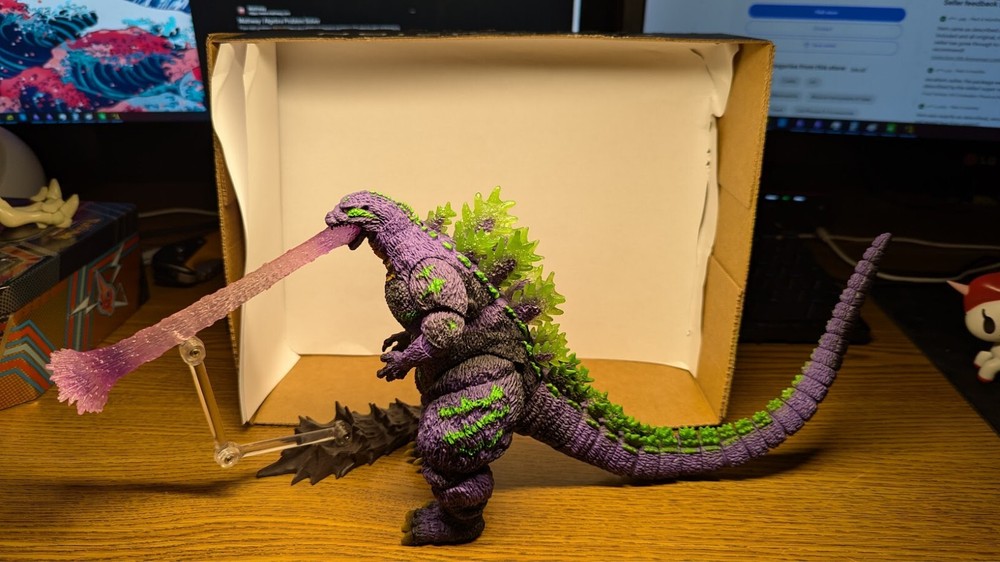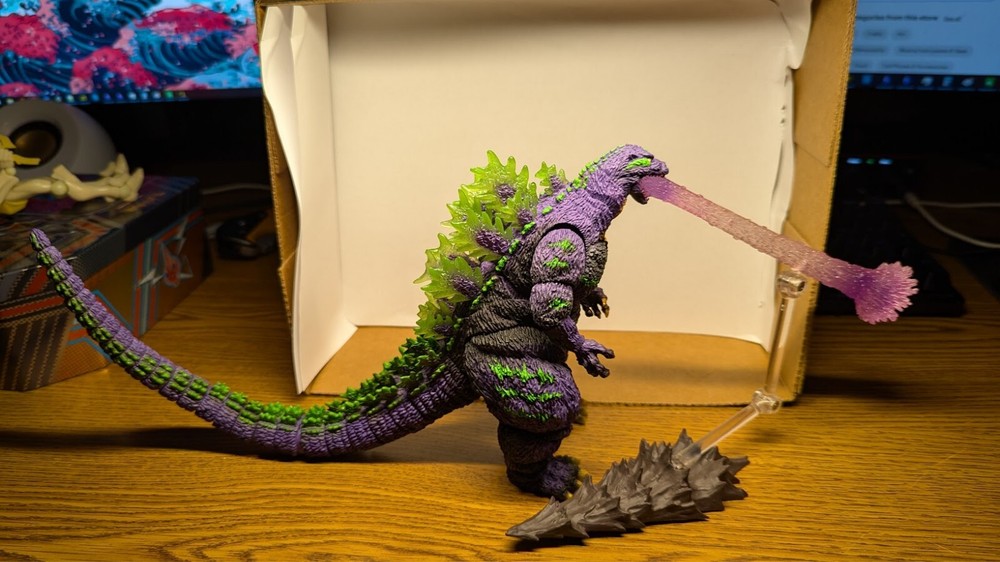 Product Description Bandai Japan presents this special version of Godzilla for their S.H. MonsterArts figure line, featuring a unique paint job in the stylings of EVA-01 from Neon Genesis Evangelion to commemorate the fantasy match Godzilla vs. EVA-01. Even Godzilla's dorsal spines are translucent featuring a purple to clear green gradient effect, which is sure to create some fantastic poses under special lighting conditions. This 6.5" Godzilla figure also comes with a special purple heat ray effect part with a charred ground base! Don't miss out on this limited collaboration of the century! Product Features 6.5 inches (16.51cm) Made of PVC and ABS Special paint job in the styling of EVA-01 Unit from Evangelion Commemorates the match Godzilla vs. Evangelion Comes with a special purple heat ray effect with a charred ground base Limited collaboration! Box Contents S.H. Figuarts Godzilla featuring EVA-01 colors Extra set of hands Purple heat ray effect and stand Special stand Additional Details S.H.MonsterArts An action figure series featuring monsters, using the movable action figure technology cultivated by S.H.Figuarts. This is S.H.MonsterArts. Neon Genesis Evangelion Neon Genesis Evangelion is a highly popular Japanese media franchise that first aired in Japan in 1995 with a successful anime series. Following Shinji Ikari, a teenage youth who is tasked with piloting giant mecha, called Evangelion, against city destroying beings called Angels. The franchise explores various religious and psychological themes that that have provided various memorable moments. Neon Genesis Evangelion is a commercial and critically successful franchise that continues to receive acclaim for the impact it continues to have. Godzilla Debuting in the iconic 1954 Japanese film Godzilla (Gojira) directed by Ishiro Honda and produced by Toho Co.; Godzilla is a monsterous creature called a Kaiju that causes havok throughout Japan. Godzilla has become a cultural icon that is widely considered to be the "King of the Monster" and has been featured in a plethora of films with various differences throughout the decades.