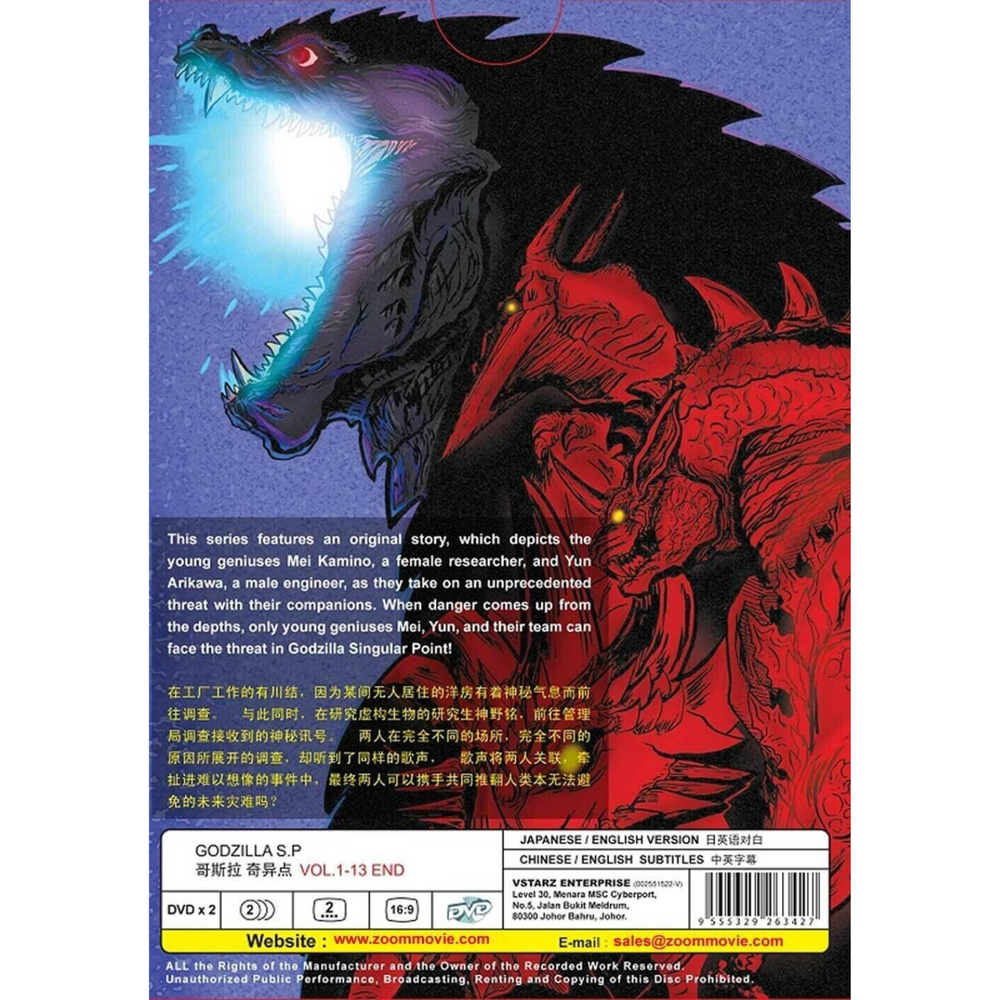 Godzilla S.P / Singular Point Anime DVD Complete TV Series Vol. 1-13 End ***FREE SHIPPING*** *** New! English Dubbed Version *** Product Information JAPANESE ANIMATION DVD Title: Godzilla S.P/Singular Point Numbers of episode: 1 - 13 (End) Numbers of discs: 2 Language: Japanese / English Subtitles: English / Chinese Format: ALL Region Condition: NEW, Original & Licensed Item Synopsis: This series features an original story, which depicts the young geniuses Mei Kamino, a female researcher, and Yun Arikawa, a male engineer, as they take on an unprecedented threat with their companions. When danger comes up from the depths, only young geniuses Mei, Yun, and their team can face the threat in Godzilla Singular Point! Payment Currently, we accept payment through eBay-managed payment. Shipping & Handling · Enjoy worldwide FREE SHIPPING on all orders. · We handle your order within 1 to 3 business days after receiving cleared payment. · Shipments are dispatched via Quantium Solutions from Malaysia. · Estimated delivery time ranges from 11 to 23 business days. · Each shipment includes a valid tracking number for your convenience. · All products are carefully packed and layered with bubble wrap to minimize damage during transit. Returns Should you encounter any issues with your order, please reach out to us through the eBay messaging system. We are more than happy to assist you and resolve the problem promptly. Items can be returned within 30 days, provided they are in good condition. Other Note: *The item price and shipping charges do not include import duties, taxes, or additional fees. Kindly note that custom import duties and taxes are the responsibility of the buyer. *Variations in screen monitors and lighting conditions may cause the actual color of the item to slightly differ from what is seen in the picture. Rest assured, we guarantee that the style remains consistent with what is depicted in the images.