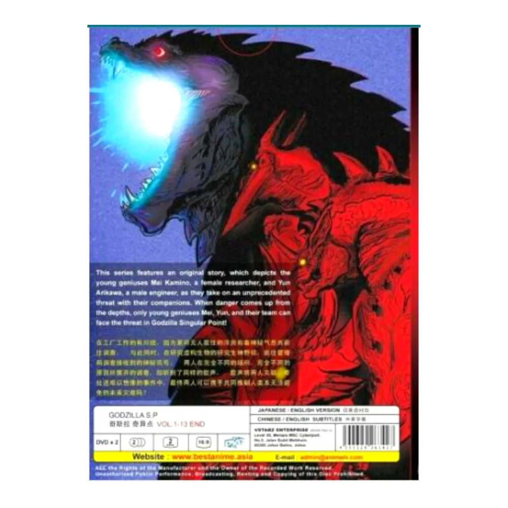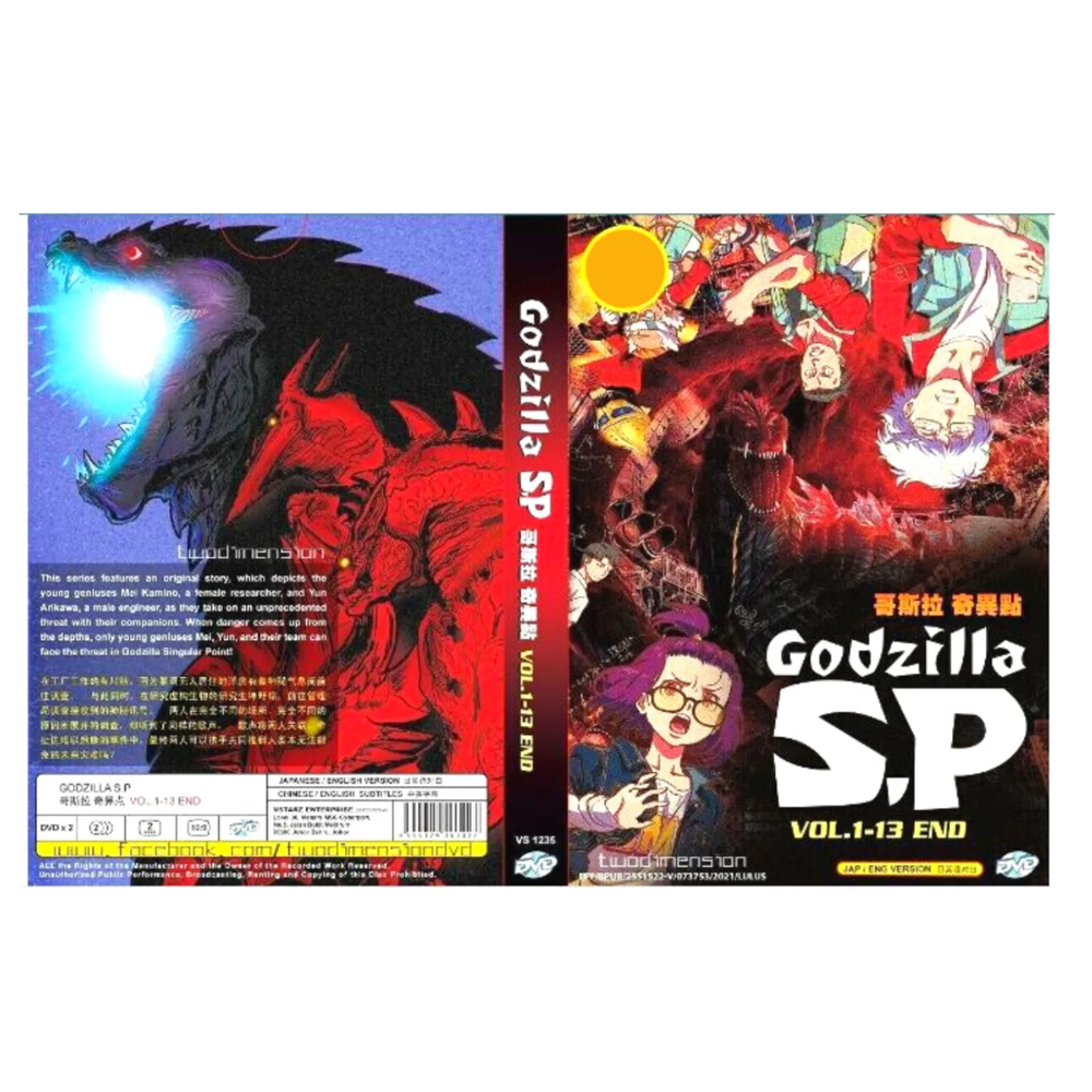 Created with Eselt - eBay Listing Designs Hope for the best. Plan for the worst. Send us a message Created with Eselt - eBay Listing Designs Our Store Seller Profile Feedback Created with Eselt - eBay Listing Designs Godzilla SP Singular Point Complete TV Series Anime DVD English Subbed Dubbed Description Payment Shipping | Returns Synopsis English Title Godzilla Singular Point Japanese Title ゴジラ S.P <シンギュラポイント> Episode 1 - 13 Released Date Spring 2021 Audio English / Japanese Subtitles English / Chinese Disk(s) 2 Region ALL/0 (Worldwide/Region Free) Notes 1. Please check other tabs for more details regarding the Payment, Shipping, & Returns. 2. Please check your shipping address, product details (country, etc.) selected carefully before placing an order. 3. Please note that due to factors such as lighting effects, monitor brightness/contrast settings, etc., the colors of the website photos may be slightly different from the actual colors. Payment Currently, we only accept payment through eBay-managed payment Notes International shipments may be subjected to additional custom fees and duties. We DO NOT pre-bill any import duties , customs fees or tariffs imposed by various government on the product. Import duties and taxes may be applied to certain countries and varies from country to country. Customs fees is incurred for customs clearance or import sales tax is levied on deliveries , the charges shall be borne by the BUYERS Buyers have to clarify the customs laws and regulations with the local authorities to obtain specific information BEFORE PURCHASE Shipping We ship from USA using USPS First Class. our handling time is 1-3 business day. Estimate time delivery in US region is 2-5 business day. we will provide a valid tracking number. You item will be wrapped with bubble wrap to ensure safety during shipment. If you have any request on customs declaration form, please leave a note when you check out. Returns If you have any problem with the order, do contact us via eBay message. we are glad to assist you and solve the problem as soon as possible. Items can be returned within 30 days in a good condition. Godzilla Singular Point This series features an original story, which depicts the young geniuses Mei Kamino, a female researcher, and Yun Arikawa, a male engineer, as they take on an unprecedented threat with their companions. When danger comes up from the depths, only young geniuses Mei, Yun, and their team can face the threat in Godzilla Singular Point! For more information: search the titles at Myanimelist/anilist Created with Eselt - eBay Listing Designs Created with Eselt - eBay Listing Designs Links Our Store Seller Profile Feedback More items Are you looking for something similar? See our other items! Show more items Contact Send us a message