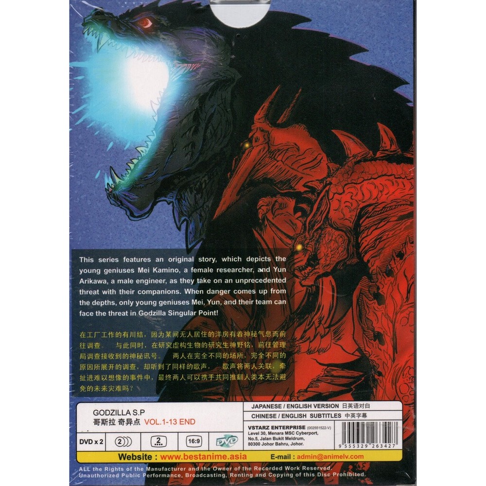 Godzilla S.P: Singular Point VOL1-13 End Voice Over : Japanese / English Episode : Vol.1-64 (End) + Movie Subtitle : English / Chinese Region Code : DVD /NSTC & All Region Code Number of Disc : DVD 2 pcs Condition : Quality Brand New, Original Factory sealed Note : All our product is original seal authentication from Malaysia Government and authorized by National Film Development Corporation Malaysia. Payment : We only Currently accept payment via eBay managed payment. Shipping : S hipping USPS Media Mail. Our Handling time is 1-3 business working days.Estimated time delivery is 2- 8 business working days. If you need fast shipping, we also provide express shipping using USPS First Class. Estimated timed delivery is 2- 5 business days. Your goods will be shipped with valid tracking number. All products is packed , layered with bubble wrap to reduce damages during shipment or delivery. Return : If you have any problem with the order, do contact us via eBay message, we will be glad to assist you and resolve your problems as soon as possible. Items can be returned within 30 days in good condition. We will refund to you once we get the item in a good conditions.