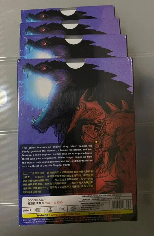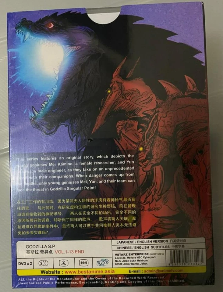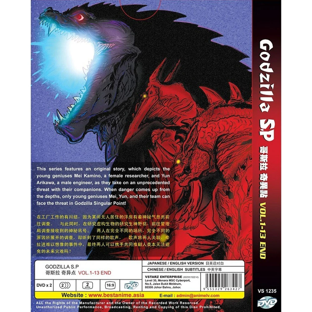 Godzilla S.P TV 1-13 End Season Anime DVD ENGLISH DUBBED All Reg FREE SHIPPING Title : Godzilla S.P Vol.1-13 End Format : DVD No Of Disc : 2 Disc Version : Japanese / English Subtitle : Chinese / English This series features an original story, which depicts the young geniuses Mei Kamino, a female researcher, and Yun Arikawa, a male engineer, as they take on an unprecedented threat with their companions. When danger comes up from the depths, only young geniuses Mei, Yun, and their team can face the threat in Godzilla Singular Point. All Item Packed With Bubble Wrap Item sold are original with Malaysia Government Hologram