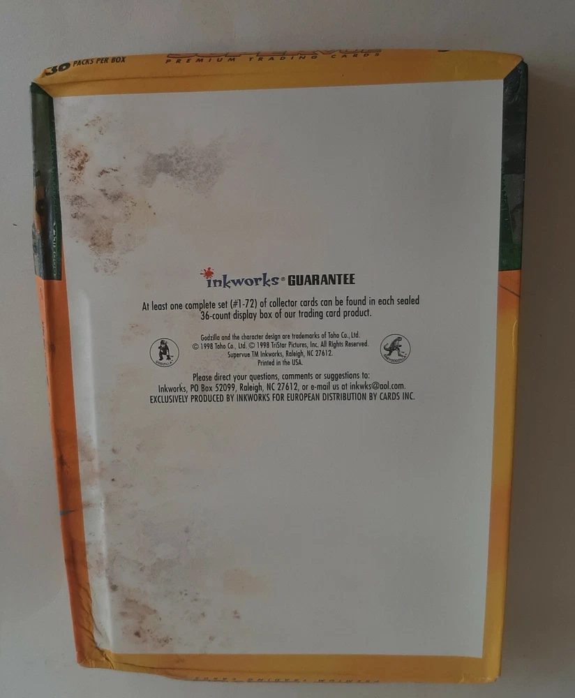 36 Pack Box of 1998 Inkworks Godzilla Supervue Cards. Box was opened and is damaged but the 36 card packs are sealed Duties and Taxes: For direct shipping (not through eBay GSP), the import duties, taxes, and brokerage fees are not included in the product price or shipping and handling cost and it will be collected upon delivery from the carriers for certain packages. These charges are recipient’s responsibility as we are only charging the transportation fee for the packages. You may check with your country’s customs office to determine what these additional costs will be.