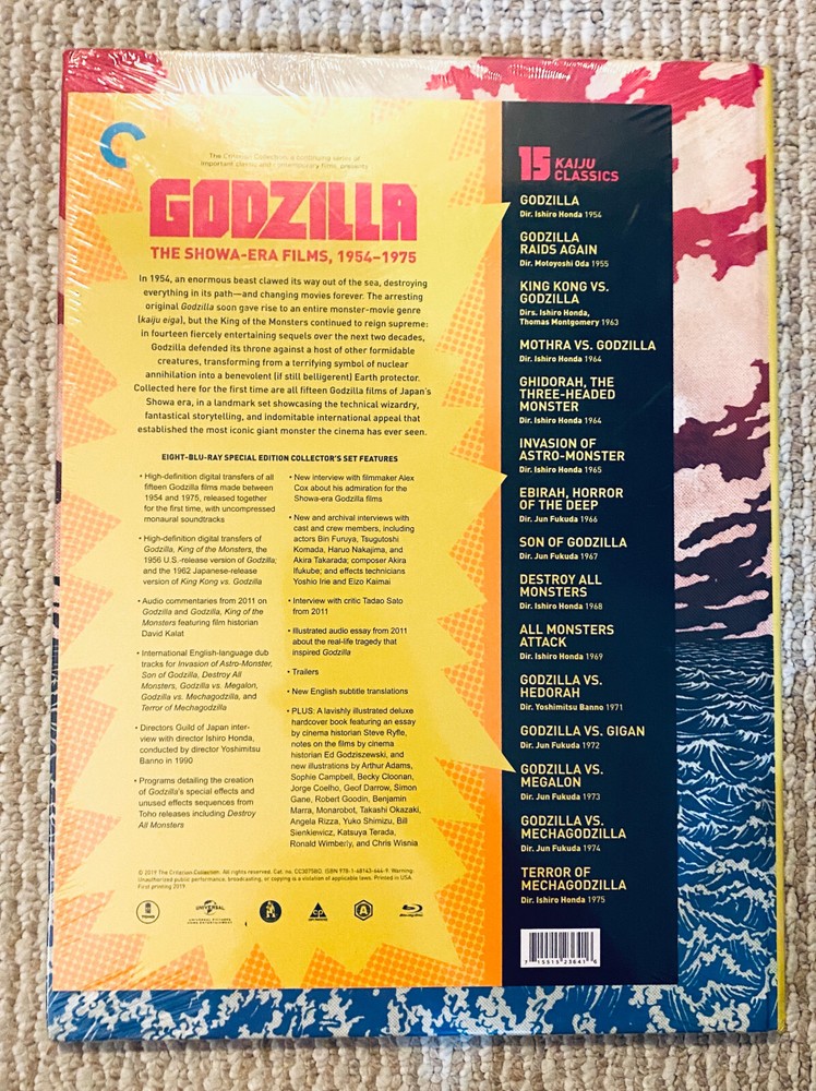 | 15 Movies, 17 Cuts | 1295 min | Not rated | Godzilla: The Showa-Era Films, 1954-1975 Bluray Video Codec: MPEG-4 AVC Resolution: 1080p Aspect ratio: 2.39:1, 2.35:1, 1.37:1 Original aspect ratio: 1.37:1, 2.35:1, 2.39:1 Audio Godzilla Japanese: LPCM Mono (48kHz, 24-bit) English: LPCM Mono (48kHz, 24-bit) Godzilla Raids Again Japanese: LPCM Mono (48kHz, 24-bit) King Kong vs. Godzilla English: LPCM Mono (48kHz, 24-bit) Japanese: DTS-HD Master Audio 4.0 Mothra vs. Godzilla Japanese: LPCM Mono (48kHz, 24-bit) Ghidorah, the Three-Headed Monster Japanese: LPCM Mono (48kHz, 24-bit) Invasion of Astro-Monster Japanese: LPCM Mono (48kHz, 24-bit) English: Dolby Digital Mono Ebirah, Horror of the Deep Japanese: LPCM Mono (48kHz, 24-bit) Son of Godzilla Japanese: LPCM Mono (48kHz, 24-bit) English: Dolby Digital Mono Destroy All Monsters Japanese: LPCM Mono (48kHz, 24-bit) English: Dolby Digital Mono All Monsters Attack Japanese: LPCM Mono (48kHz, 24-bit) Godzilla vs. Hedorah Japanese: LPCM Mono (48kHz, 24-bit) Godzilla vs. Gigan Japanese: LPCM Mono (48kHz, 24-bit) Godzilla vs. Megalon Japanese: LPCM Mono (48kHz, 24-bit) English: Dolby Digital Mono Godzilla vs. Mechagodzilla Japanese: LPCM Mono (48kHz, 24-bit) English: Dolby Digital Mono Terror of Mechagodzilla Japanese: LPCM Mono (48kHz, 24-bit) English: Dolby Digital Mono Subtitles Godzilla English, English SDH Godzilla Raids Again English King Kong vs. Godzilla English, English SDH Mothra vs. Godzilla English Ghidorah, the Three-Headed Monster English Invasion of Astro-Monster English Ebirah, Horror of the Deep English Son of Godzilla English Destroy All Monsters English All Monsters Attack English Godzilla vs. Hedorah English Godzilla vs. Gigan English Godzilla vs. Megalon English Godzilla vs. Mechagodzilla English Terror of Mechagodzilla English Discs Blu-ray Disc Eight-disc set (8 BD-50) Packaging DigiBook, Inner print Playback 2K Blu-ray: Region A 100% Guaranteed Authentic Extremely Rare and Out of Print Tracking in USA, International shipping available Note: If there are any Questions or Concerns with your order, Please contact us First before leaving any feedback. We take pride in our company and will respond back within 24 hours promptly to answer any questions or correct any concerns. More pictures of DVD are available upon request! Please Check out my other Rare OOP "Out of Print" dvds on my other auctions! We want you to know exactly what you are getting here at "RAREDVDGEEKS." We are not a big company that sells millions of dvds, just a small INDEPENDENT company you can trust to handle your purchase on a personal level! Please email us with any questions that you may have and receive a quick personal response! Buy more and save on shipping! You can trust our 100% FEEDBACK!! We Ship Worldwide !!!!! Check out our "about me" page for more about us. We love dvds just as much as you do and No Bootlegs are ever sold!