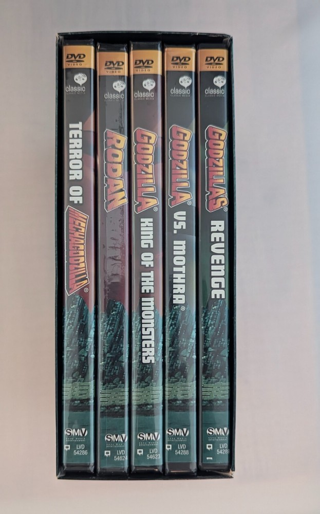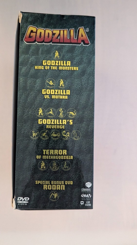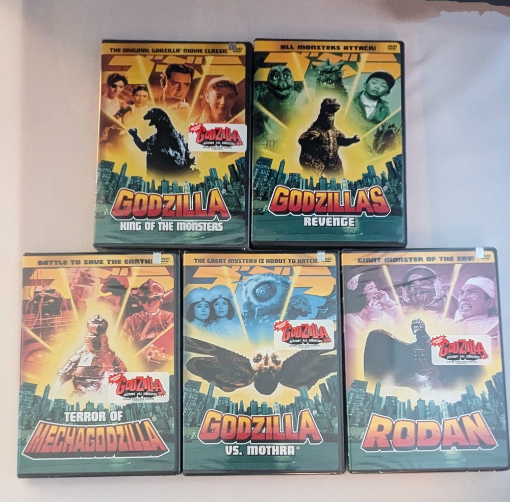 Set includes DVD special feature game preview inside unopened. All items sealed except 'Godzillas Revenge'. Includes original GODZILLA (1956), GODZILLA VS. MOTHRA (1964), GODZILLA'S REVENGE (1969), TERROR OF MECHAGODZILLA (1975), and RODAN (1956).