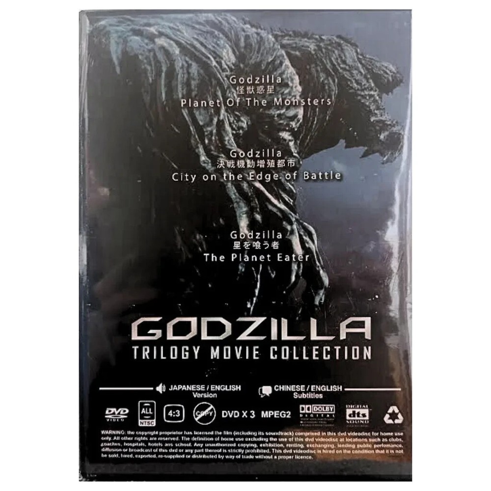 Dive into the thrilling world of monsters and adventure with the Godzilla Trilogy Movie Collection. This 3-in-1 anime DVD set, featuring the works of director Hiroyuki Seshita and producer Satoshi Motoyama, delivers an epic narrative that combines the classic elements of action, animation, and sci-fi fantasy. The set is complete with English and Japanese language options, as well as subtitles in Chinese and Malay, catering to a diverse audience. The collection comes in a sleek tall/DVD case, offering a standard edition box set experience. Fans of the franchise will appreciate the crisp 16:9 aspect ratio and the dubbed audio, ensuring an immersive viewing experience. Whether you're revisiting the series or discovering it for the first time, this collection is a must-have for enthusiasts of the genre and fans of Japanese anime alike. Product Description: Title : DVD Godzilla Trilogy Movie Collection Language: Japanese/English Subtitle: English/Chinese Media Type: NTSC; Fullscreen 4:3, All Region DVD Edition Year: 2020 Weight : 171g No. of Disc: 3 DVD 1. Godzilla: Planet of The Monsters 2. Godzilla: City on the Edge of Battle 3. Godzilla: The Planet Eater