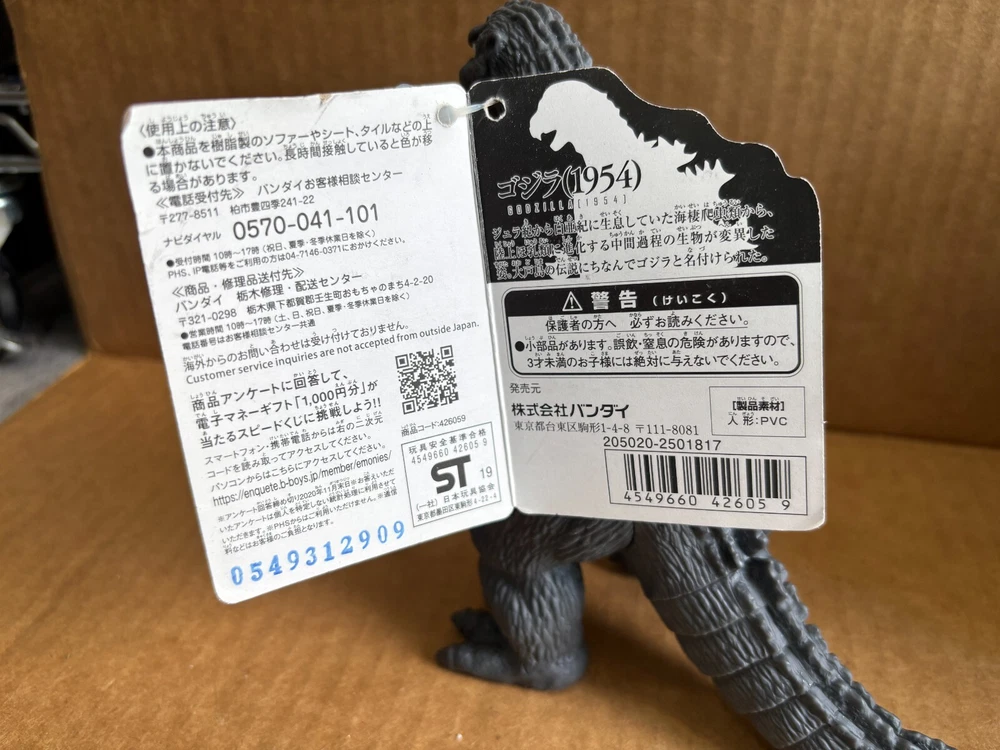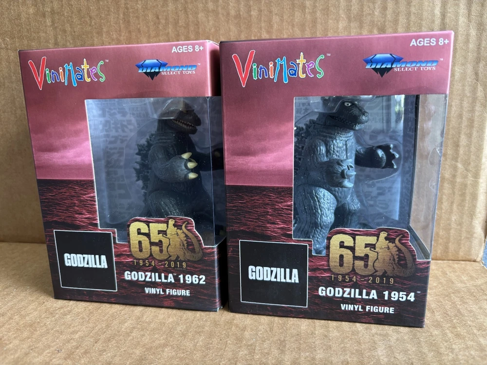 PLEASE READ THIS DESCRIPTION CAREFULLY..Nice 3 piece lot of vinyl poseable Godzilla figures. First is a 6" tall x 7" long Godzilla from the "Movie Monster Series" made by Bandai and dated 2019. It is modeled after the Godzilla of 1954. It is in wonderful un-played with condition with the original cardboard folded tag attached. The next two figures are 4" tall, were made by Diamond Select in 2019 and are from the "Vinimates" 65th Anniversary of Godzilla series. The first one is modeled after the original Godzilla from 1954 and the second one depicts Godzilla from 1962. Both come still sealed in their original boxes. Boxes are excellent. All three are fully licensed Godzilla figures. See attached pics for a better idea on the condition of these figures and packaging.