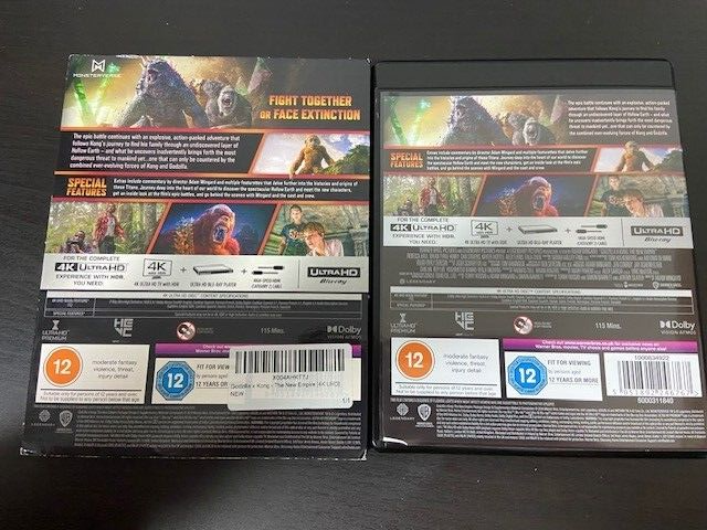 Godzilla X Kong: The New Empire 4K Ultra HD Blu-ray [Region Free] Discs 4K Ultra HD Blu-ray Disc Single disc (1 BD-100) Packaging Slipcover in original pressing Playback 4K Blu-ray: Region free Three years after the events of Godzilla vs. Kong, Monarch heads into the Hollow Earth after receiving a mysterious signal. At the same time, Kong befriends a juvenile ape named Suko, who leads him to a secret empire of Great Apes and the imprisoned ice Titan Shimo, ruled by the ruthless ape Titan Skar King. Through the meditation of the revived Mothra, Godzilla and Kong join forces against the Skar King's army. Director: Adam Wingard Writers: Terry Rossio , Simon Barrett , Jeremy Slater , Adam Wingard Starring: Rebecca Hall , Brian Tyree Henry , Dan Stevens , Kaylee Hottle , Alex Ferns , Fala Chen Producer: Mary Parent