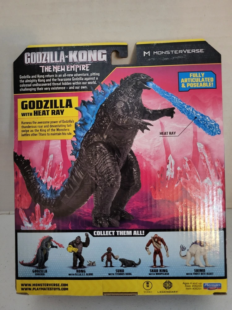 This is a limited edition, fully jointed action figure of Godzilla from the movie "Godzilla X Kong: The New Empire". The figure is made of ABS plastic and stands at 8 inches tall with an adjustable heat ray feature. . The product is part of the Playmates Toys brand and is recommended for ages 8-11 years. The figure is based on the character Godzilla and is part of the Monsterverse franchise.