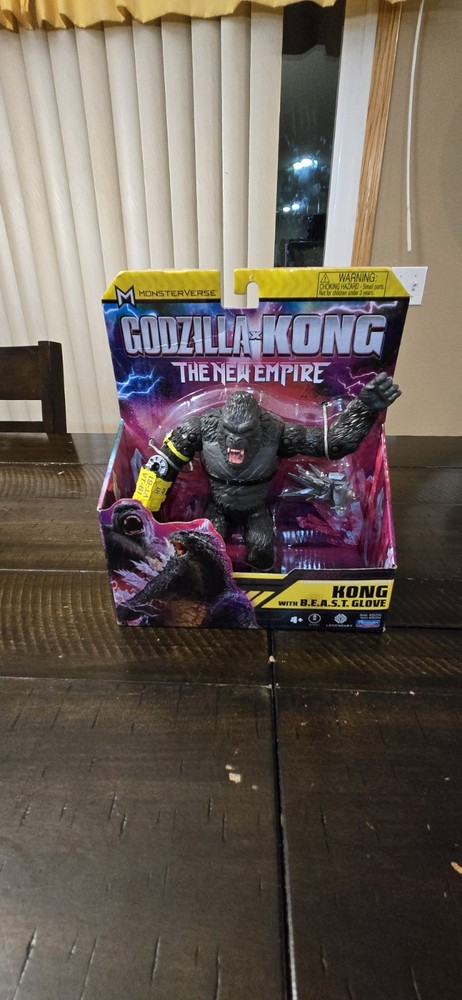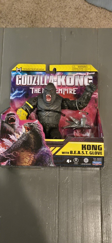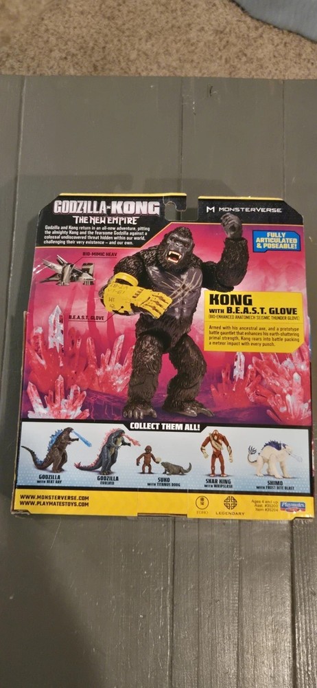 The Godzilla X Kong The New Empire: Kong with Beast Glove action figure is a 7-inch tall plastic toy based on the character King Kong from the Godzilla vs. Kong movie. This black-framed figure comes with Beast Gloves and is part of the Godzilla x Kong franchise by Playmate Toys. Suitable for ages 4 and up, this collectible item is themed around the movie franchise and is packaged in a boxed set made in China. Perfect for fans of King Kong and action figure collectors alike, this toy brings the iconic character to life with intricate details and accessories.