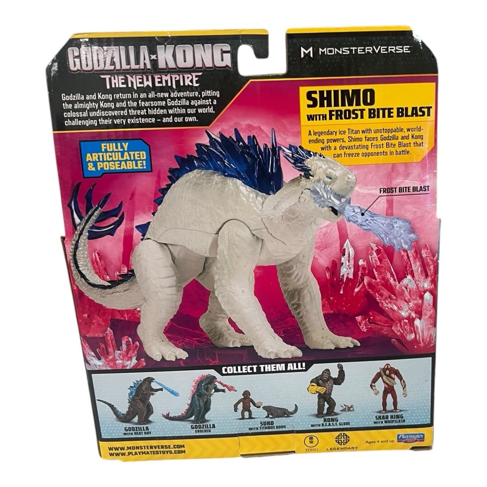 Experience the epic battle of Godzilla and Kong with the new 6-inch SHIMO action figure from Playmates. This highly detailed figure features a Frost Bite Blast and is perfect for fans of the Godzilla franchise. With a recommended age range of 4 and up, this toy is sure to provide hours of fun for collectors and kids alike. This figure is part of the Godzilla X Kong: The New Empire line and is manufactured in China. It is an excellent addition to any collection and is sure to be a hit with fans of the series. Don't miss your chance to add this incredible SHIMO action figure to your collection today!