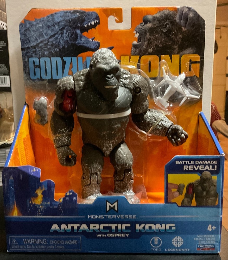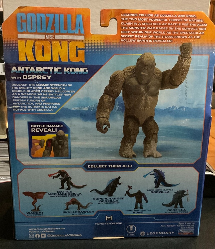 PICTURES OF THE KONG FIGURE ARE EXACTLY WHAT YOU WILL RECEIVE. KONG HAS NEVER BEEN REMOVED FROM ITS PACKAGE. FIGURE IS FACTORY MINT AND NEVER USED. OUTSIDE PACKAGE HAS SMALL AMOUNT OF SHELFWEAR FROM STORAGE AND AGE. Experience the epic battle of Godzilla vs Kong with this highly detailed and collector's edition Antarctic Kong action figure from Playmates Toys. This 6-inch figure features a battle-damaged reveal and comes with an authentic Osprey and mixed lot accessories. The adjustable and chase features make it a must-have for collectors of all ages. This original and licensed reproduction from the Godzilla franchise is based on the 2021 movie and is perfect for all occasions and fans of TV, movie, and video games. The multicolor figure is made of high-quality plastic and has a scale of 1:12. The packaging is original and unopened, making it an ideal gift for anyone.