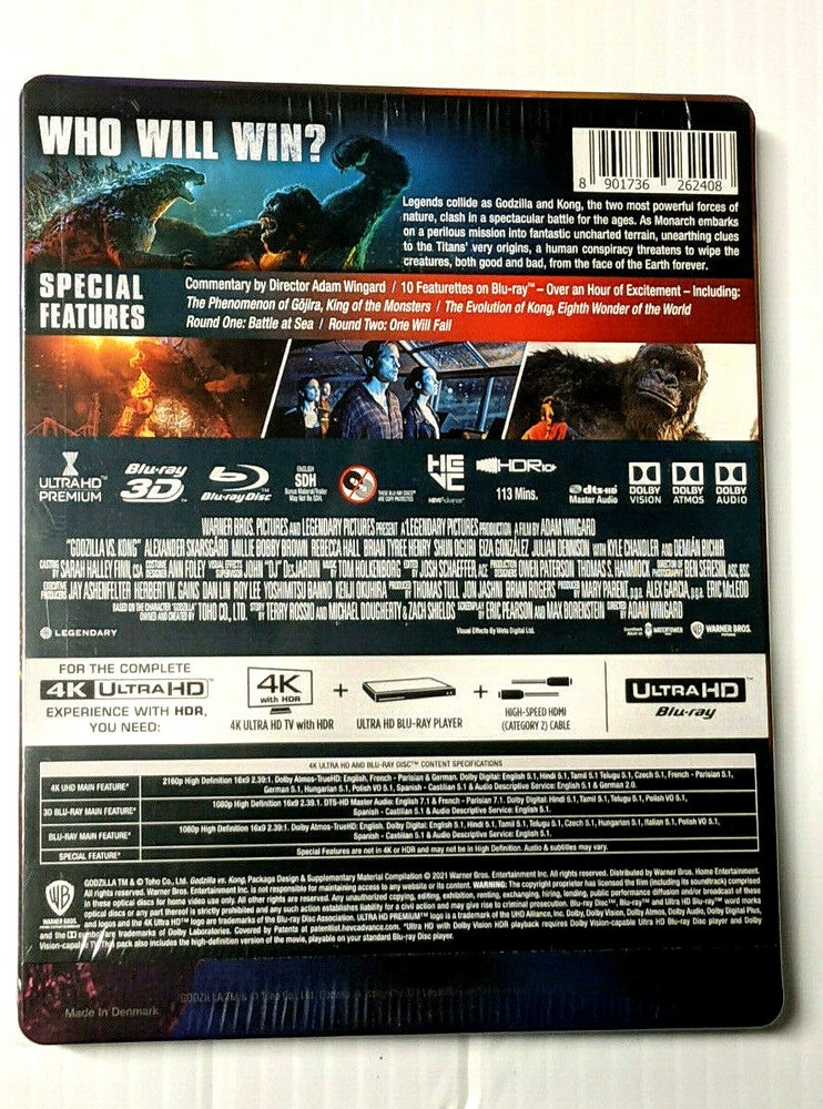 **********PLEASE READ WITH CARE********* THIS IS A BRAND NEW STEELBOOK COLLECTION OF GODZILLA VS KONG STEELlBOOK (4K Ultra BLU-RAY+ 3D Blu-Ray+ Blu-ray ) 3 DISK STEELBOOK THIS IS A INTERNATIONAL RELEASE REGION FREE MEANING THAT THESE DISK'S WILL WORK ON ANY 4K AND 3D BLU-RAY PLAYER PLEASE LOOK AT THE PICTURES WHAT YOU SEE IS WHAT YOU WILL RECEIVE THIS STEELBOOK IS BRAND NEW NOT OPEN OR VIEWED THE STEELBOOK BOX SET IS FACTORY SEALED I SHIP THE SAME DAY IF THE ORDER IS MADE BEFORE 2PM EASTERN TIME THIS ITEM WILL BE SHIPPED WITH CARE IN A WELL SEALED BUBBLE WRAP MAILER I SHIP AS IF I WAS GOING TO ORDER IT MY SELF *****NOTE I ACCEPT RETURNS UNDER THE CONDITIONS***** *****ARE STILL NEW IN ITS ORIGINAL WRAPPING***** *****AND ITS NOT DAMAGE IN ANY WAY***** *****I GUARANTY THIS ITEM TO***** *****BE SHIPPED VERY SPECIAL***** DO NOT HESITATE TO ASK ANY QUESTION THANK YOU Description At a waystation in a remote desert, Will (Winston Duke), an arbiter, interviews prospective souls for rebirth. The sudden death of Will's most treasured soul, Amanda, upends his fragile, unusual existence, as numerous candidates vie to occupy the space Amanda left behind. As Will grapples with his grief and struggles to choose between two finalists--Kane the cynic (Bill Skarsgård) and Emma the empath (Zazie Beetz)--he must ultimately confront his own arrested existence if he is to achieve catharsis. Written and directed by Edson Oda.~Maggie Sadler Genre Action and Adventure,Sci-Fi Subgenre Creature Film,Sci-Fi Action,Sci-Fi Adventure Title Godzilla vs. Kong Countries Produced Australia Duration 113 minutes Year of Release 2020 Product Tags SteelBook 4K Ultra HD Blu-ray/3D Blu-ray, Blu-ray Format 4K Ultra HD Blu-ray, Blu-ray, 3D Blu-ray Program Type Movie Studio Warner Home Video