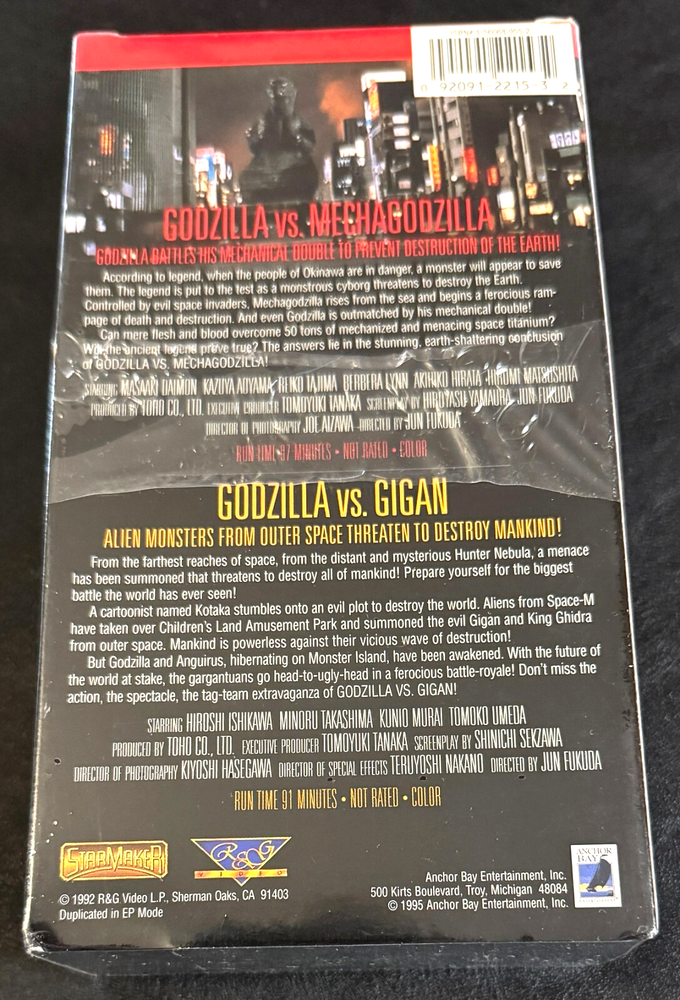 Godzilla vs Mechagodzilla & Godzilla vs Gigan Double Feature VHS 2 Pack. In very good condition, slip case does have some wear on it. Please see pictures for exact condition of item.