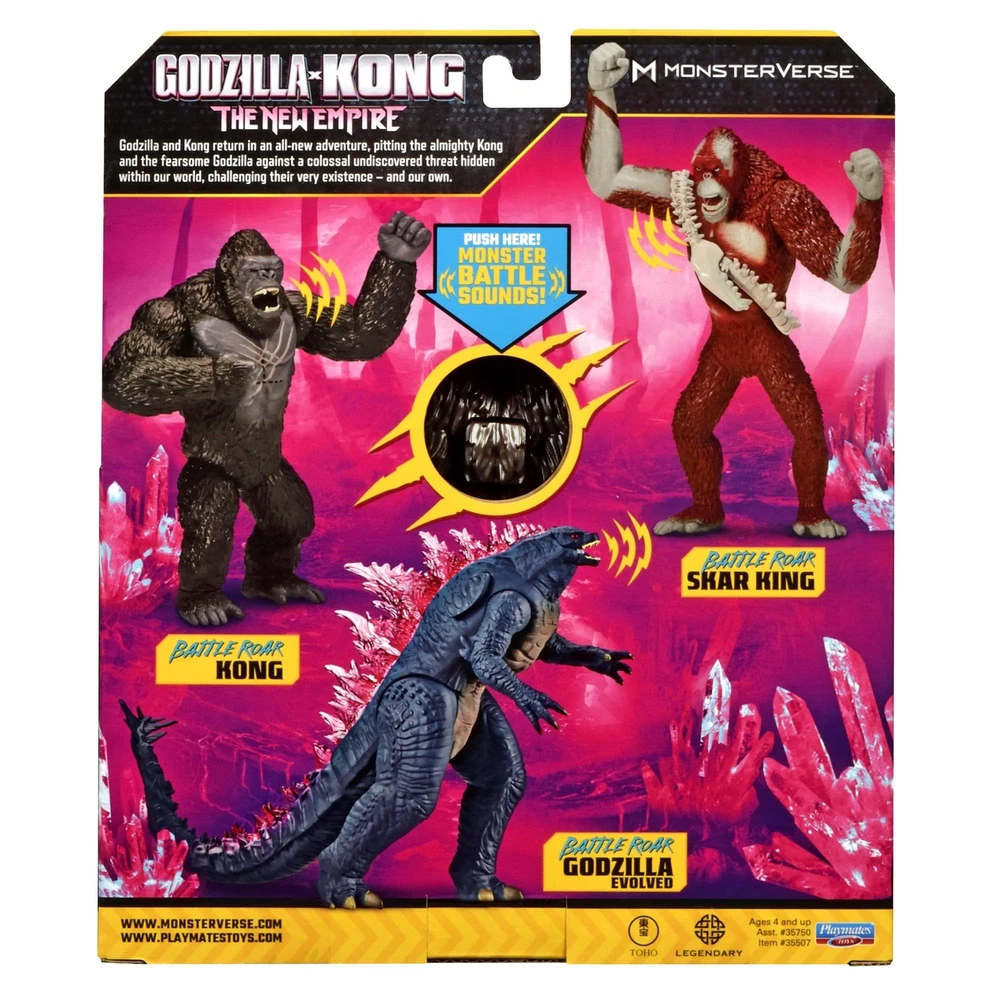 Godzilla x Kong 7" Battle Roar Kong Figure by Playmates Toys Description Return to Hollow Earth with Godzilla and Kong in an all-new adventure! When a colossal threat is discovered within our world, Godzilla and Kong must fight to protect their existence—and our own. The Godzilla x Kong 7” Battle Roar Kong brings the King of Skull Island to your collection, with epic new details that capture his movie look. Set includes Kong’s Battle Roar sound effects and comes in a unique Godzilla X Kong package! Features: Command the battlefield with a fearsome roar! Unleash Kongs mighty battle cry by pressing the button on his back. Kongs mouth is highly detailed and molded from soft rubber to create a realistic expression as he lets out a roar. The 7 Battle Roar Kong offers multiple points of articulations, allowing for dynamic action poses so you can recreate intense battles and relive his most iconic fight scenes. The Godzilla x Kong 7 Battle Roar Kong figure is highly detailed with intricate designs to capture the essence of the King of Skull Island. From his powerful Battle Roar to imposing figure, every detail is made to match the new movie, ensuring an authentic representation of his iconic character. Complete your monstrous collection with other figures and accessories from the new Godzilla x Kong line. Choose from a wide range of characters, including old allies, dangerous foes, and new challengers to recreate epic battles and awesome new adventures! Build your very own MonsterVerse with Playmates Toys. Product Details: Manufacturer Minimum Age (MONTHS): 48.0 Is Assembly Required: No Color: Multicolor Theme: Science Fiction Collection Name: Toys & Games Play Activity Location: Tabletop Is Autographed: No Are Batteries Required: Yes Number of Batteries: 3 LR44 batteries required. (included) Additional Features: Interactive Audio Toy Figure Type: Action Figure UPC: 043377355076 Model Name: Godzilla x Kong 7" Battle Roar Kong Figure by Playmates Toys Subject Character: Kong Model Number: 35507 Brand Name: Godzilla Outer Material: Cardboard Material Type: Plastic Inner Material: plastic Number of Pieces: 1 Item Dimensions L x W x H: 8.5"L x 3.5"W x 10"H Shipping Free fast shipping Return Policy All items qualify for returns within 30 days of receipt.