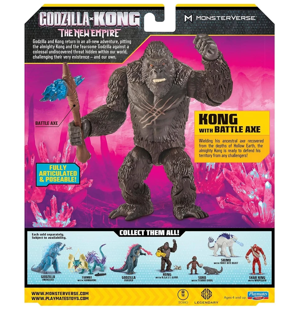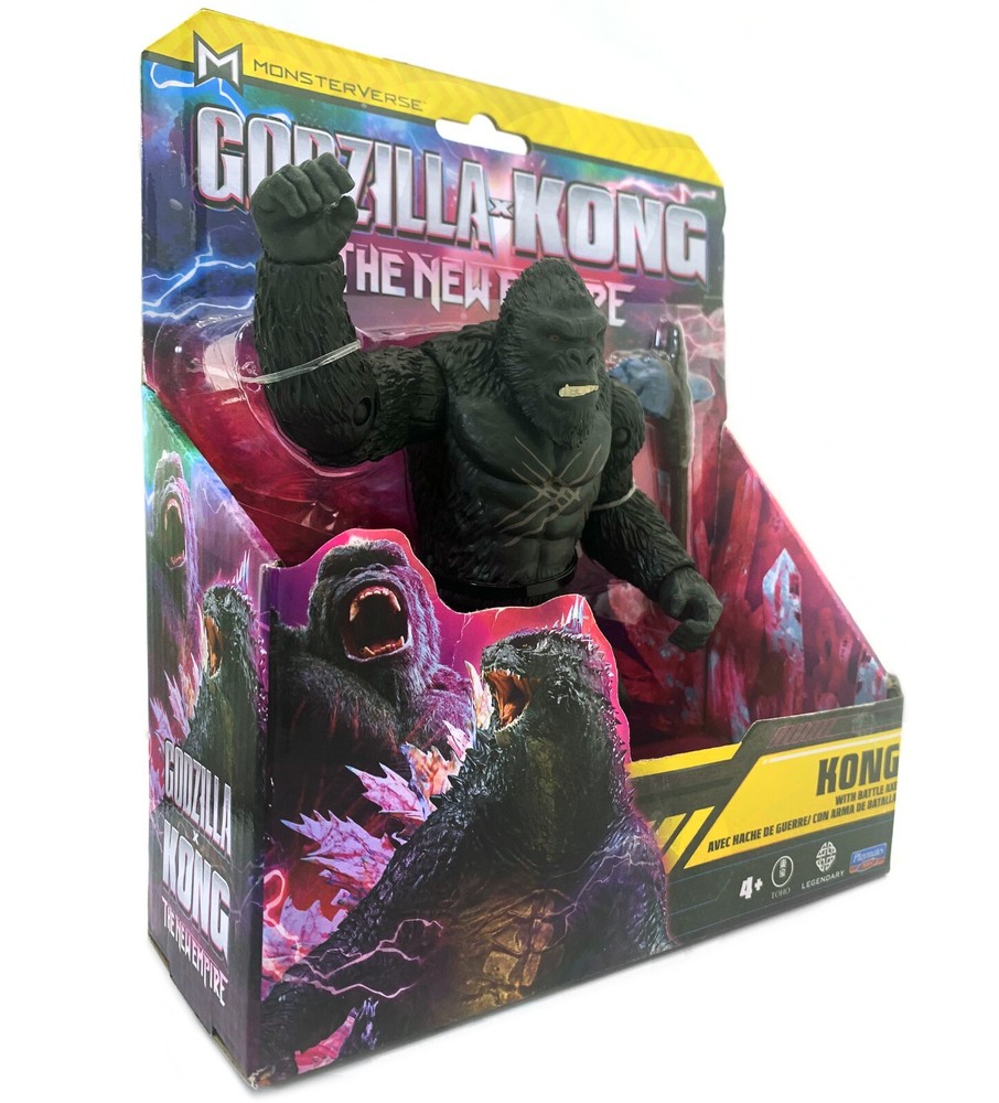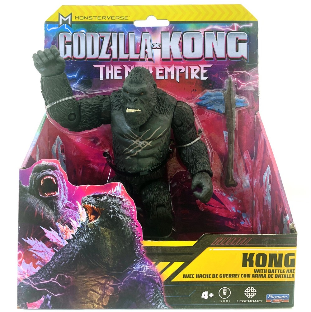 KONG 6-INCH ACTION FIGURE with BATTLE AXE by Playmates Godzilla and Kong return to the Hollow Earth in the MonsterVerse blockbuster Godzilla x Kong: The New Empire . Kong action figure stands approx. 6" tall and features several points of articulation. Includes Kong's Battle Axe. BRAND NEW, factory sealed.