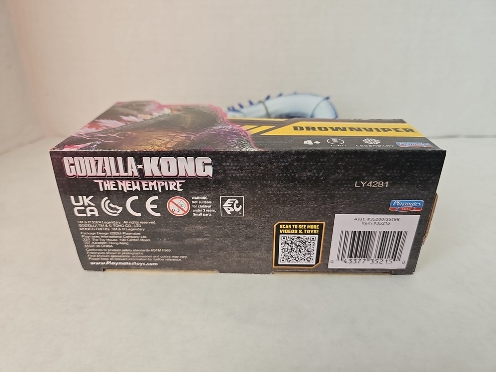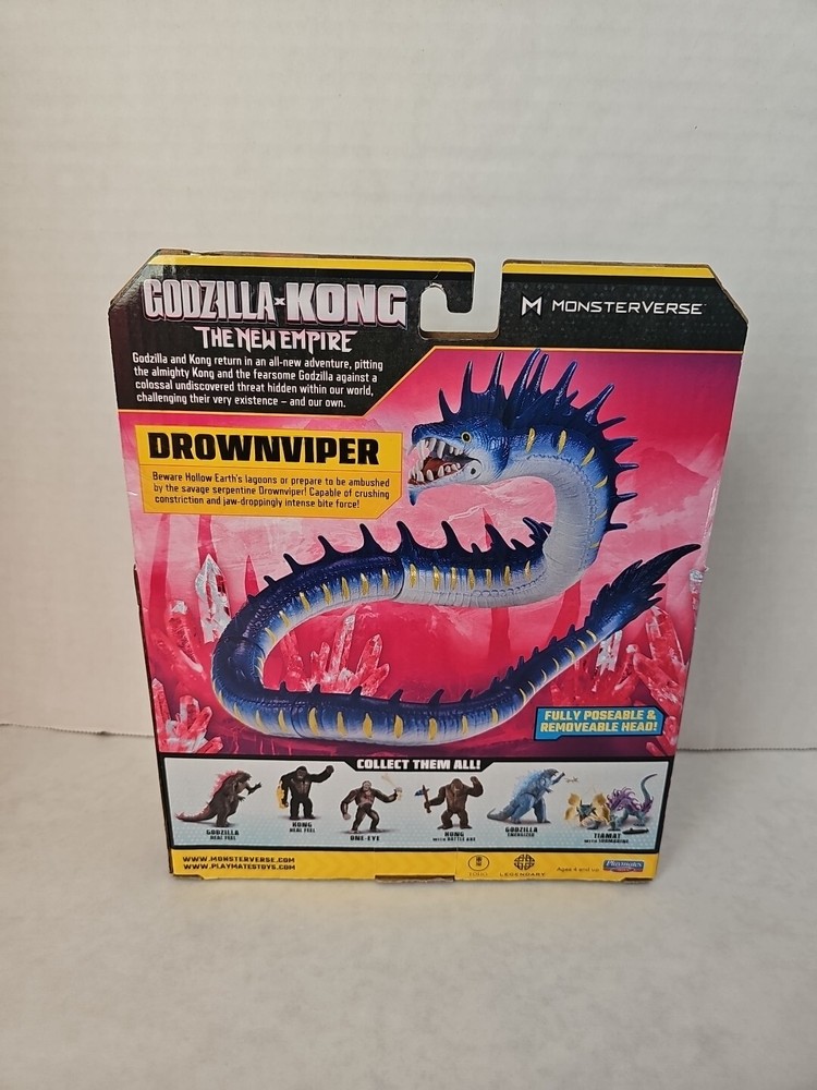The product is a Godzilla x Kong New Empire Drownviper action figure from the Monsterverse series. It features characters Godzilla, King Kong, and Drownviper in a TV show-themed design. The action figure is 7 inches tall, made of plastic, and part of the Godzilla franchise. It is from the Godzilla x Kong series by Playmates, with a ship vehicle type and a blue color scheme. Year manufactured is 2024.