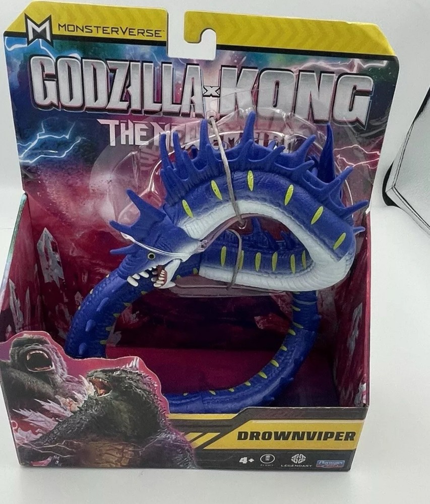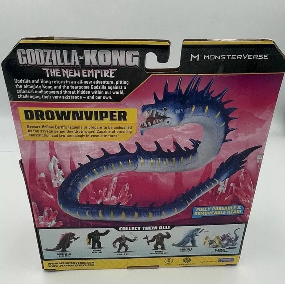 The product is a 7" action figure of Drownviper from the movie "Godzilla x Kong The New Empire." It is part of the Monsterverse franchise and is manufactured by Playmates Toys in 2024. The action figure features Drownviper, a character from the movie, and is made of plastic. The color of the figure is blue, and it is an original item, not a reproduction, related to TV, movie, and video games themes. Brand new sealed Next day shipping