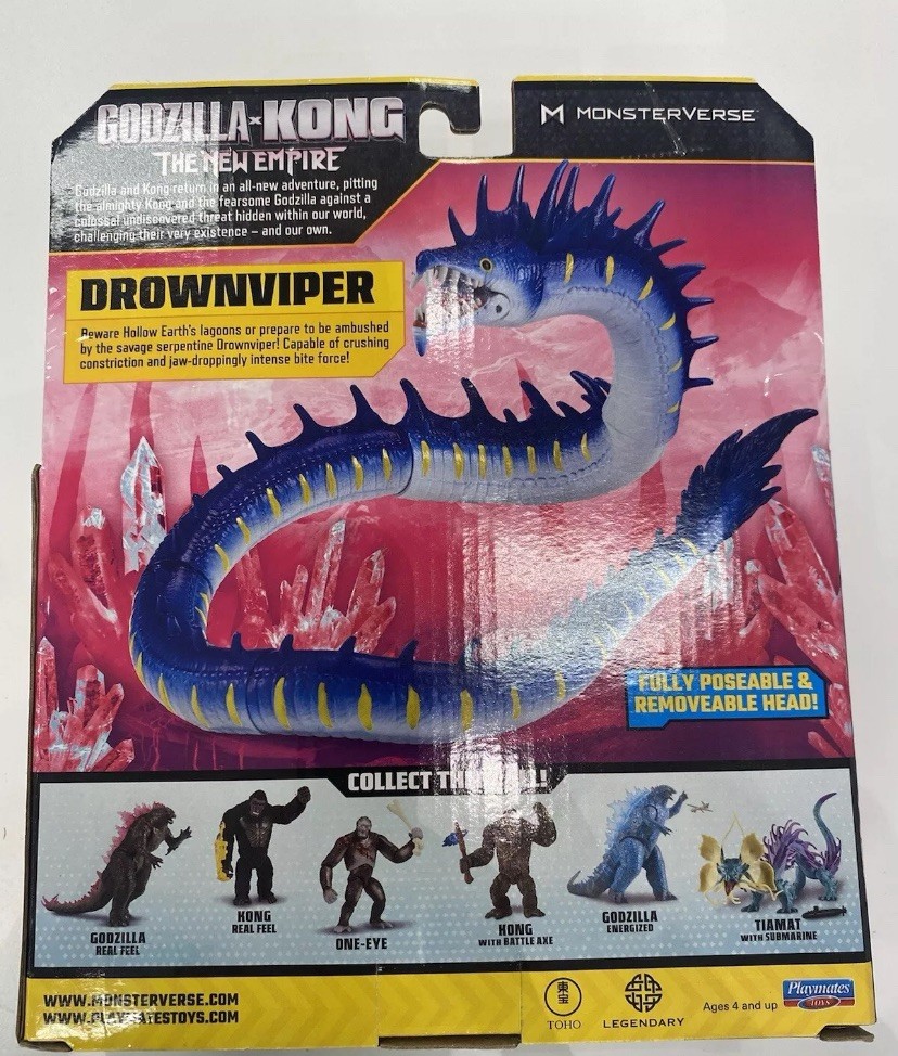 Dive into the thrilling world of Monsterverse with the Godzill x Kong The New Empire "DROWNVIPER" action figure. Meticulously crafted by Playmates Toys, this multicolored plastic figure stands ready for display or to recreate epic battles from the movie. It features intricate details that bring the fearsome creature to life, complete with articulation for dynamic posing. Ideal for fans aged 4 and up, this 1:12 scale DROWNVIPER figure is a must-have for any collector or enthusiast. It's a licensed reproduction, ensuring authenticity, and it's manufactured in China with the quality you expect from Playmates Toys. Collect this piece of the Godzill x Kong franchise and let the battle begin.